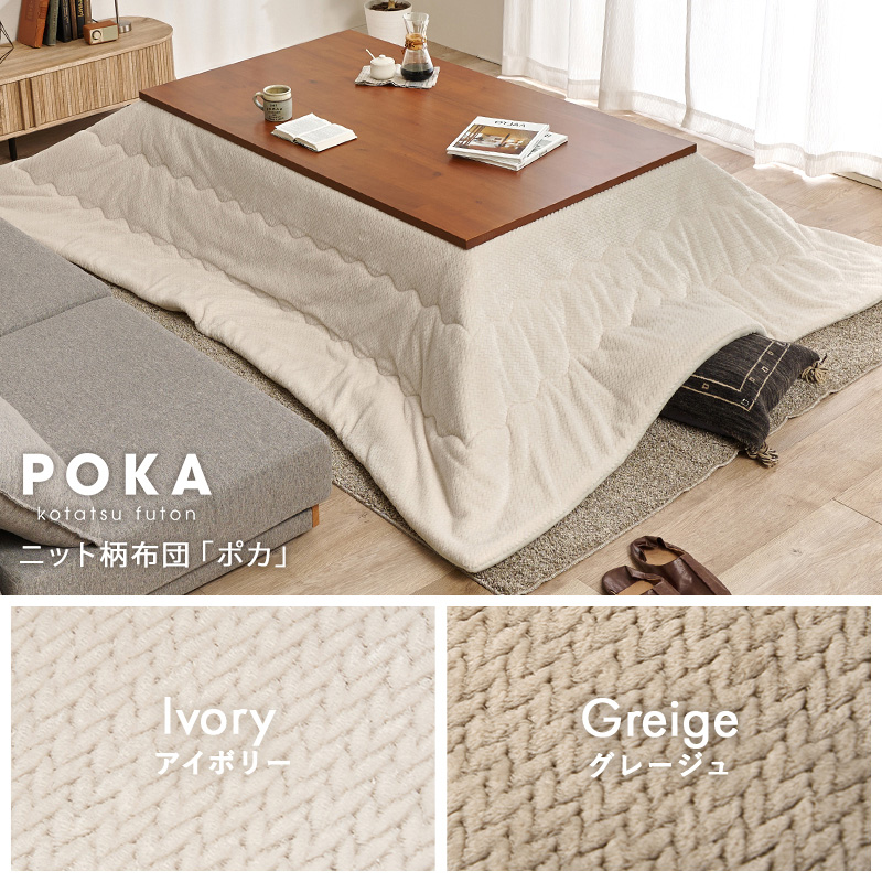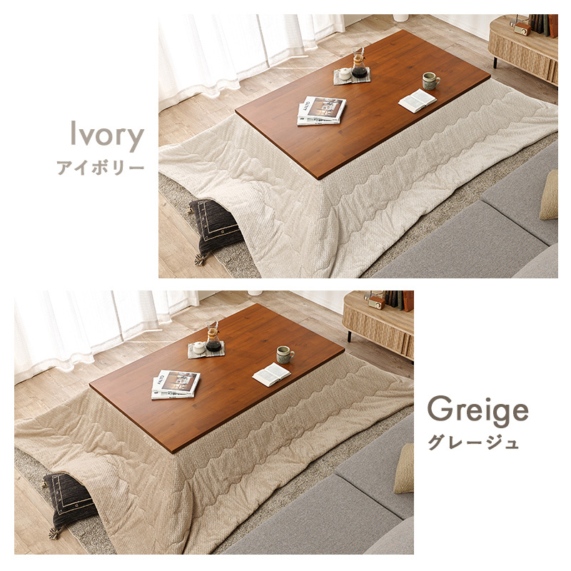 天然木アカシアの集成材突板を使用し、味のある風合いを楽しめるこたつテーブル。立体感のあるニット柄の掛け布団セット