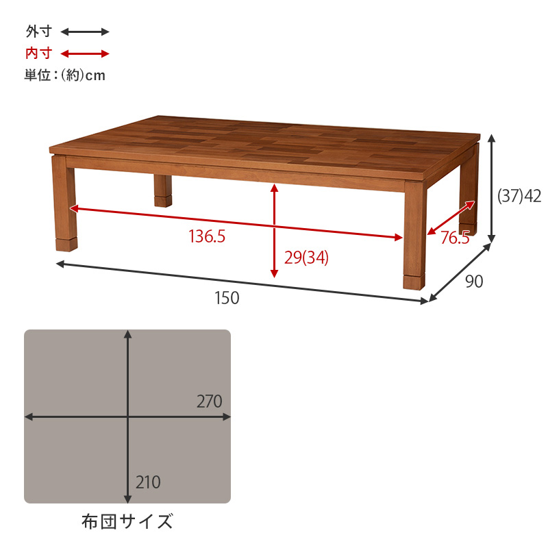 | サイズ | こたつ:(約)幅150×奥行90×高さ37/42cm、ふとん:(約)270×210cm |