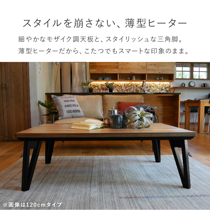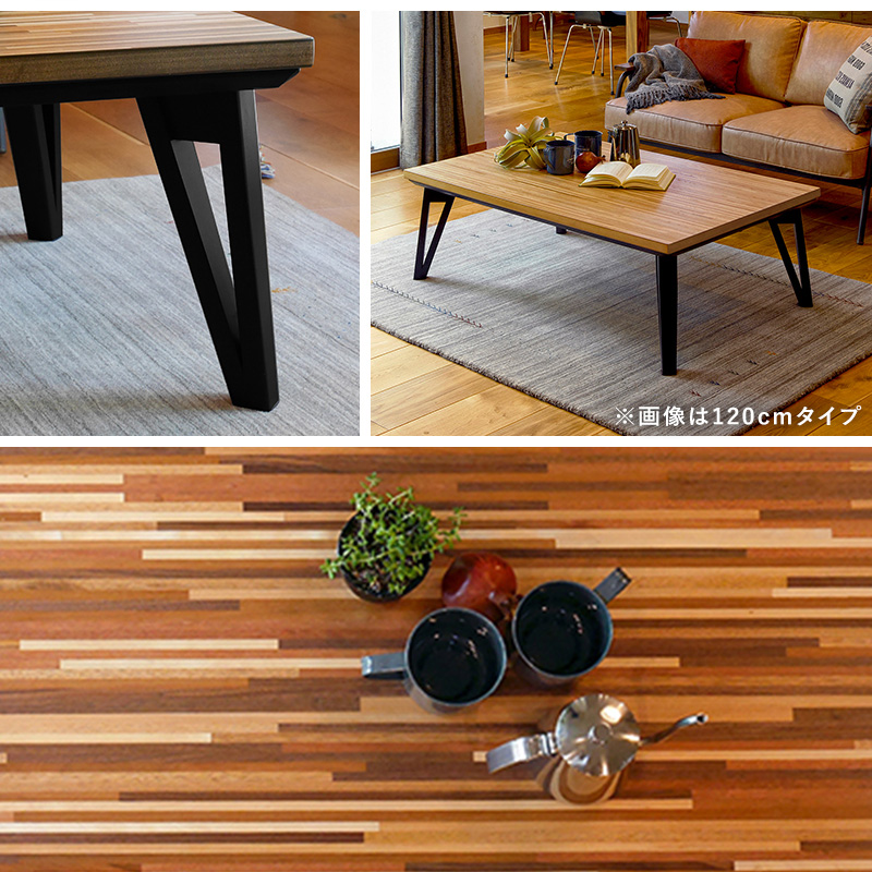 細やかな寄木細工調の天板と三角脚がスタイリッシュなコタツ。立体感のあるニット柄の掛け布団セット