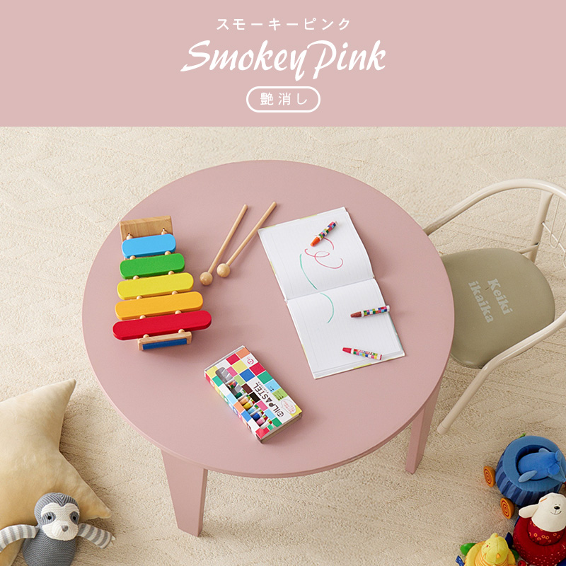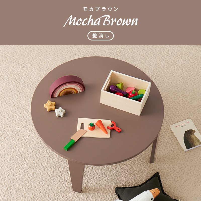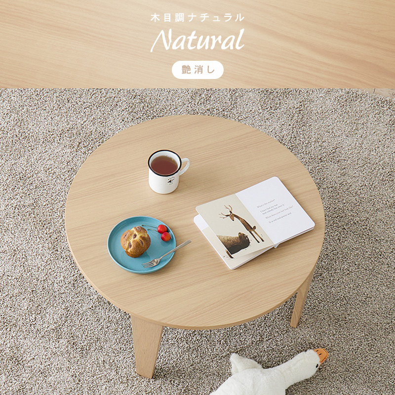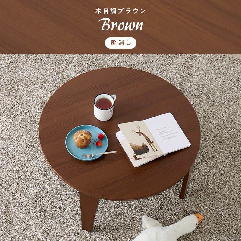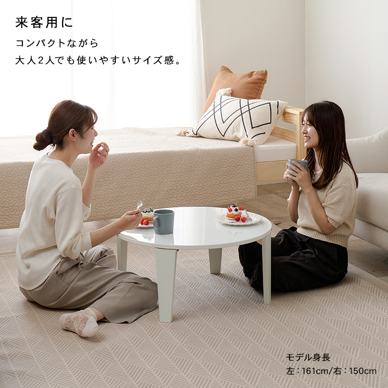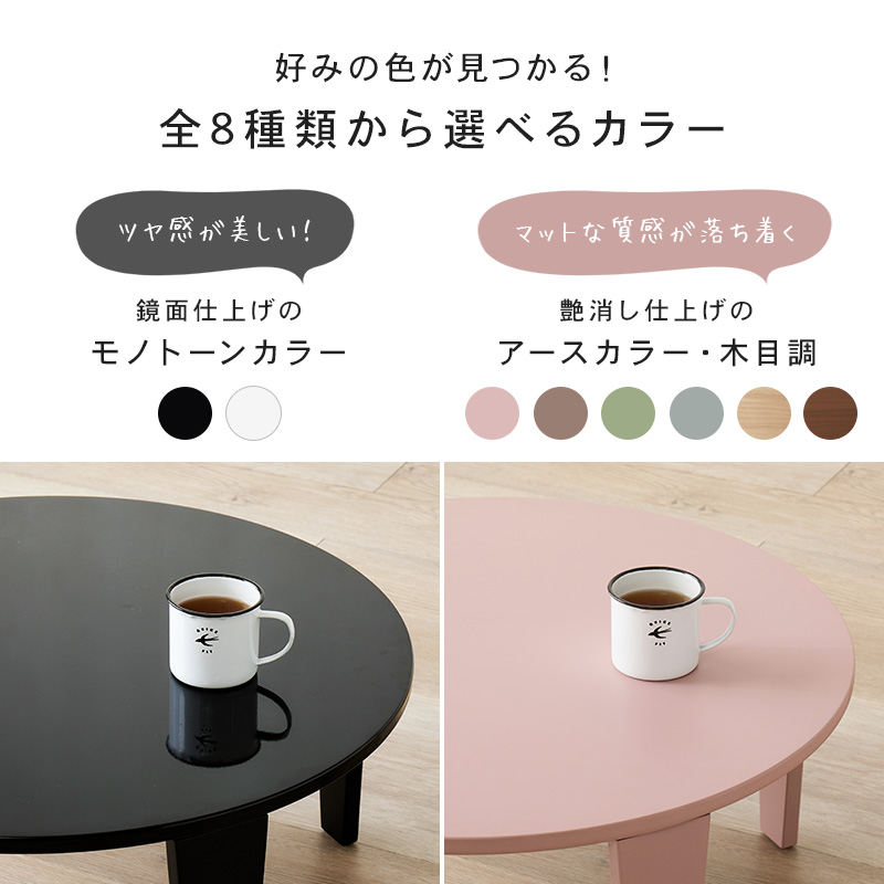 くすみカラーやモノトーンカラーが選べ、コンパクトサイズでワンルームや1人部屋にぴったりな円形テーブル。省スペース収納可能な折れ脚タイプ