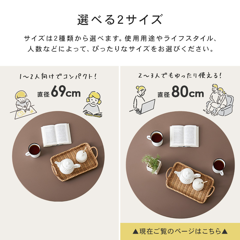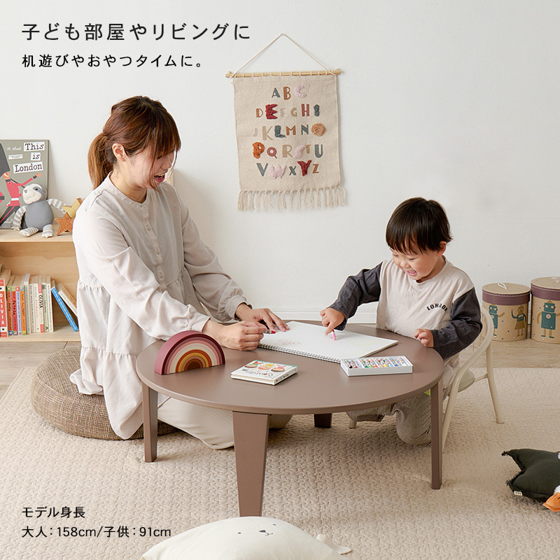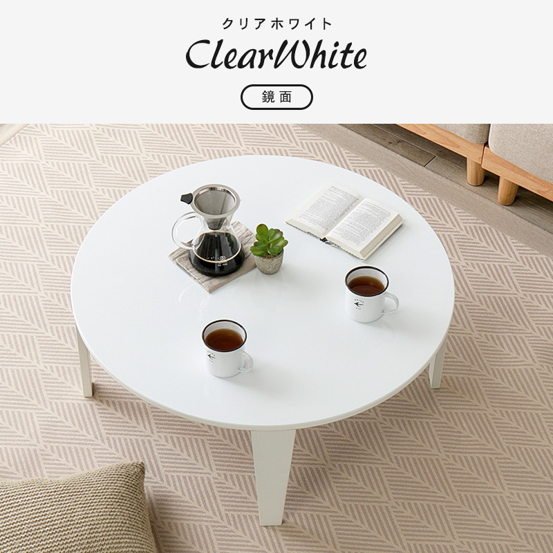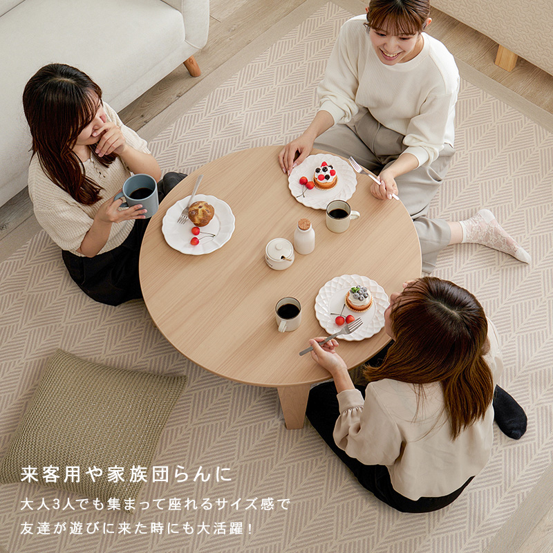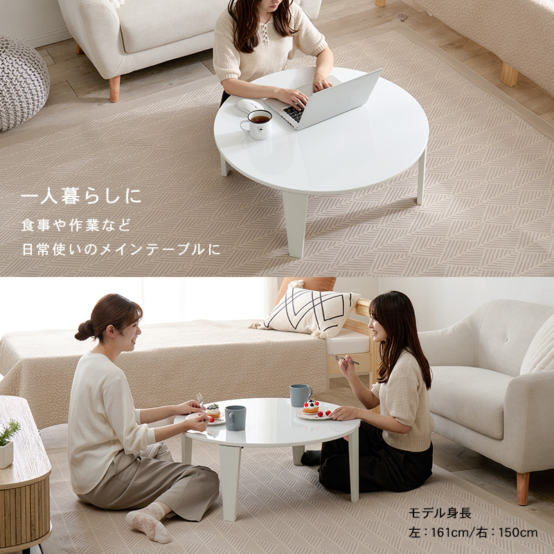 くすみカラーやモノトーンカラーが選べ、来客時や2~3人でゆったり使える大きめサイズの円形テーブル。省スペース収納可能な折れ脚タイプ
