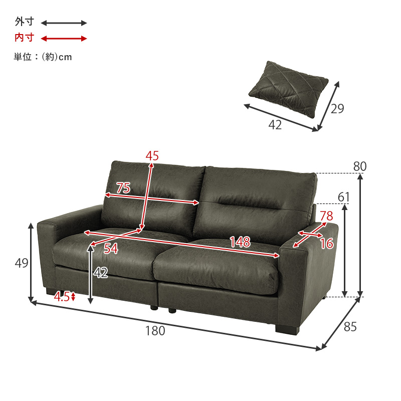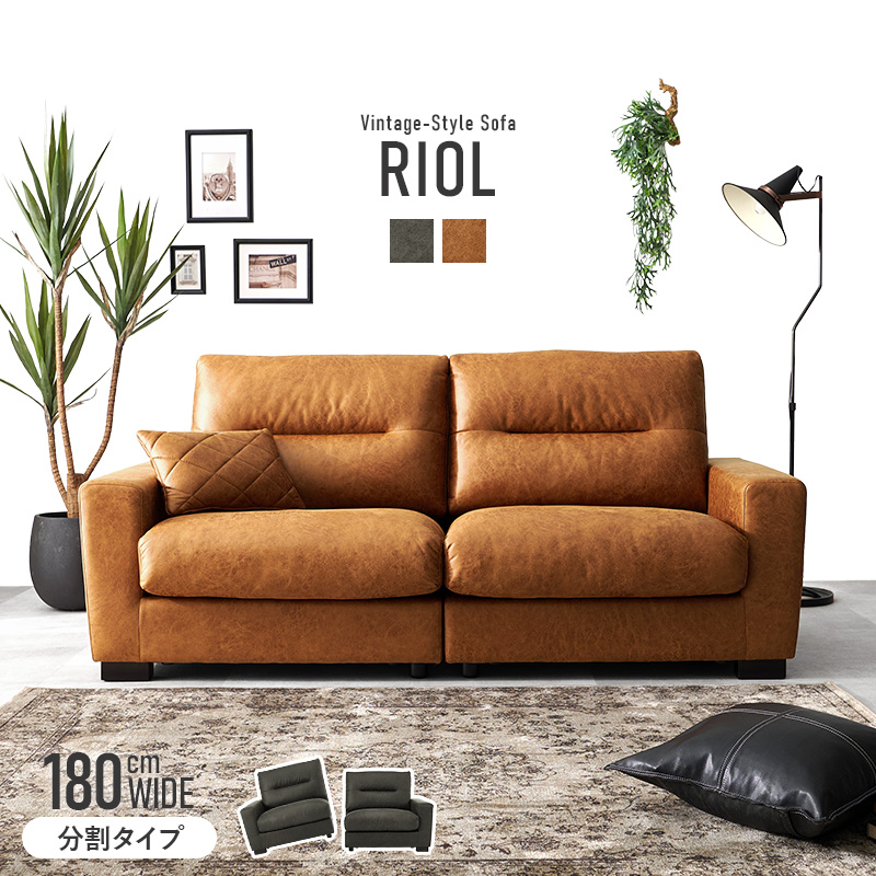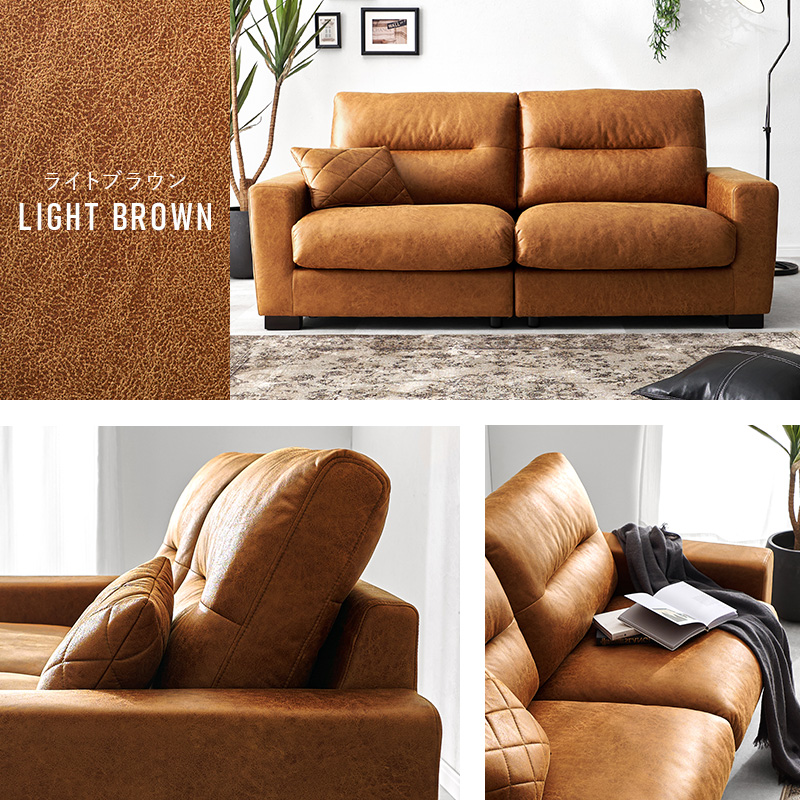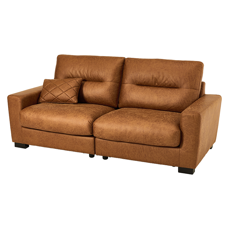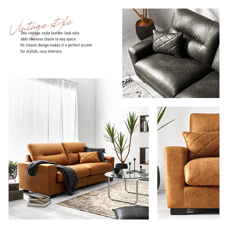 ボリュームと張りのあるシルエットが落ち着いた印象のヴィンテージレザー調3人掛けソファ。