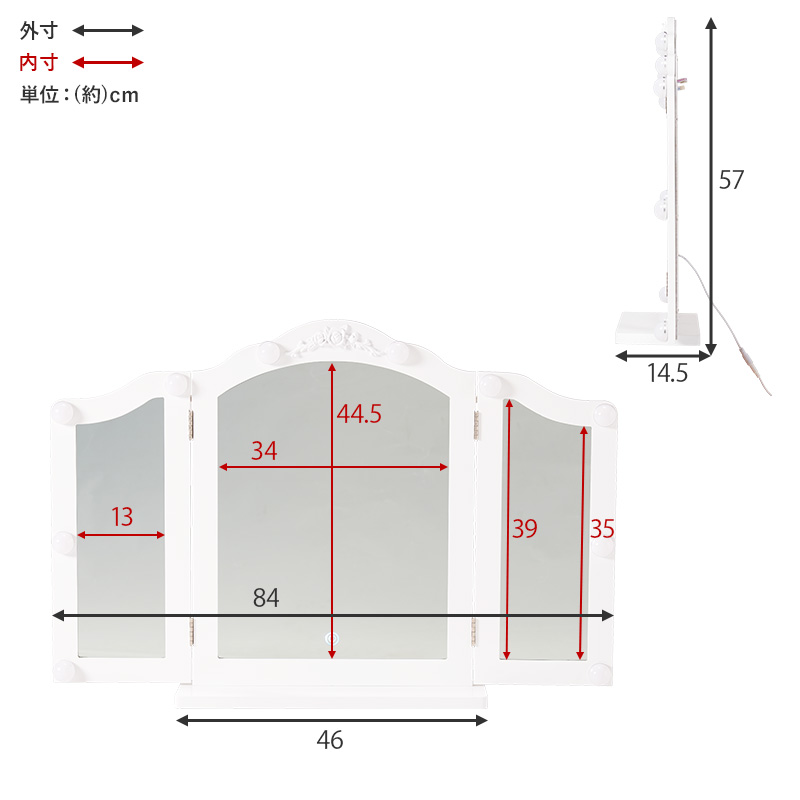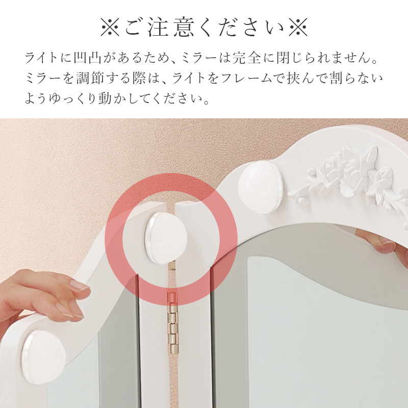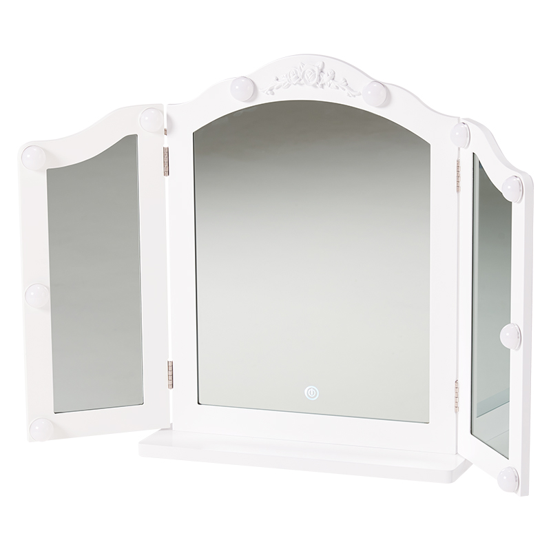自宅のテーブルに置くだけで、本格的なLEDライト付き三面鏡ドレッサーに。メイクやヘアセットに大活躍。