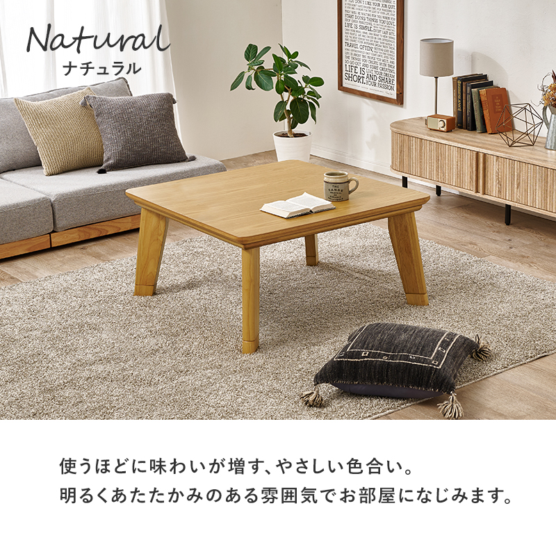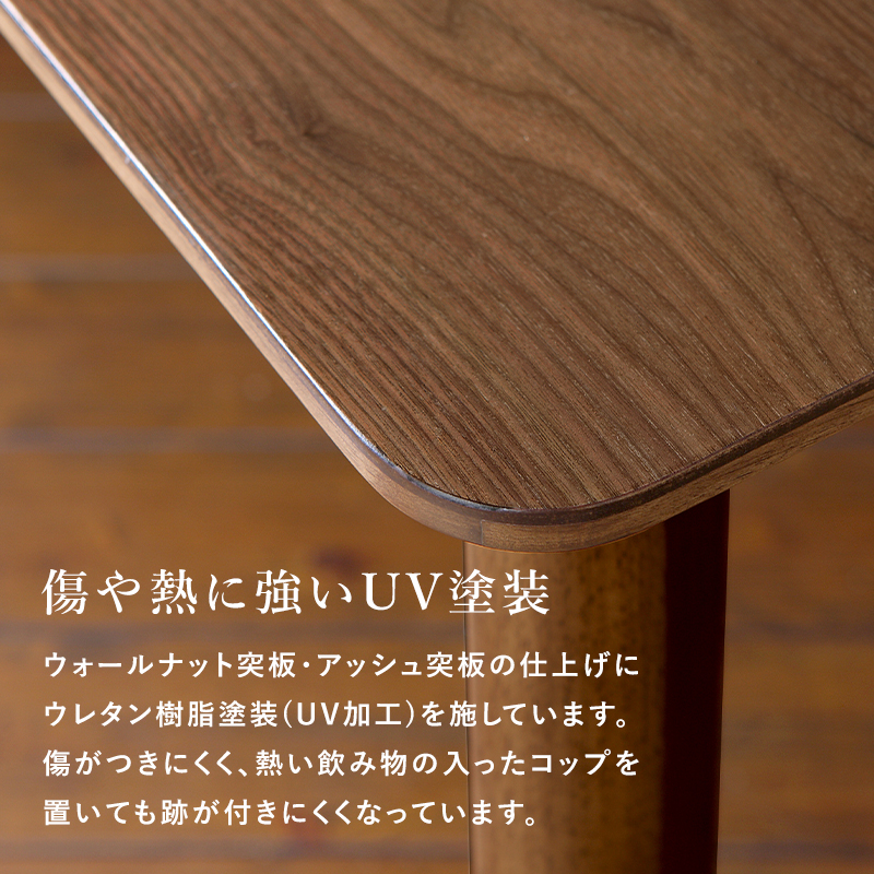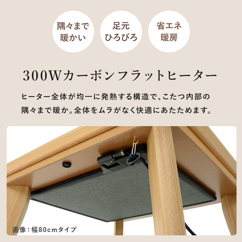 | 素材 | こたつ:<天板>天然木化粧繊維板(ナチュラル/アッシュ・ブラウン/ウォールナット)<脚部>ラバーウッド、ヒーター:MCR-301E 300W面状カーボンヒーター(電子手元コントローラー)、ふとん:< 側地><中材>ポリエステル100% |