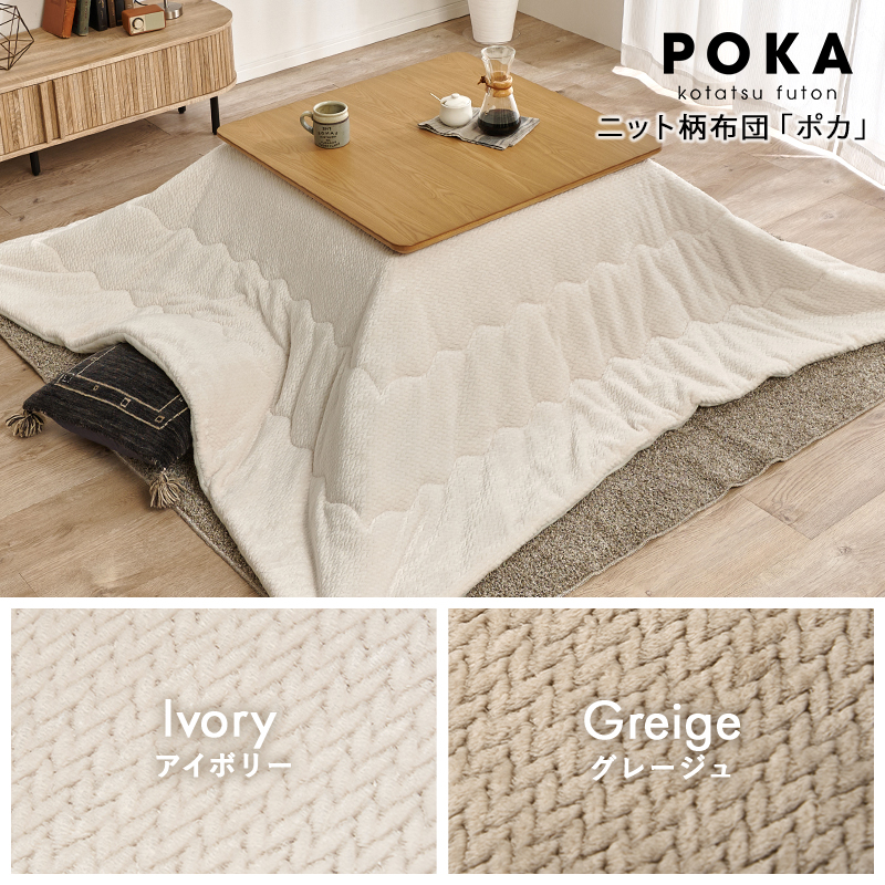 スタイリッシュながら存在感のあるディテール、薄型ヒーターを使用しているため一年中使いやすいコタツ。立体感のあるニット柄の掛け布団セット