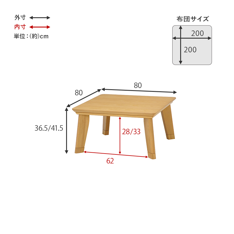 | サイズ | こたつ:(約)幅80×奥行80×高さ36.5/41.5cm、ふとん:(約)200×200cm |