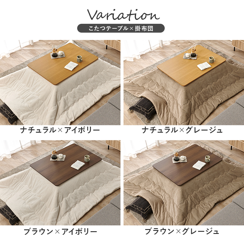 | 素材 | こたつ:<天板>天然木化粧繊維板(ナチュラル/アッシュ・ブラウン/ウォールナット)<脚部>ラバーウッド、ヒーター:MCR-301E 300W面状カーボンヒーター(電子手元コントローラー)、ふとん:< 側地><中材>ポリエステル100% |