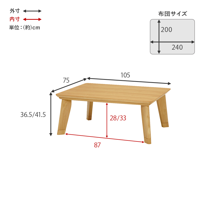 | サイズ | こたつ:(約)幅105×奥行75×高さ36.5/41.5cm、ふとん:(約)240×200cm |