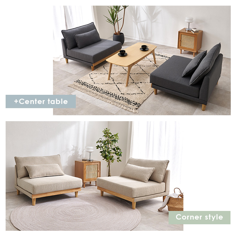 空間を遮らず開放感のある低重心設計。ごろ寝ができる広々座面は、分割出来てレイアウトも自由に変更可能。
