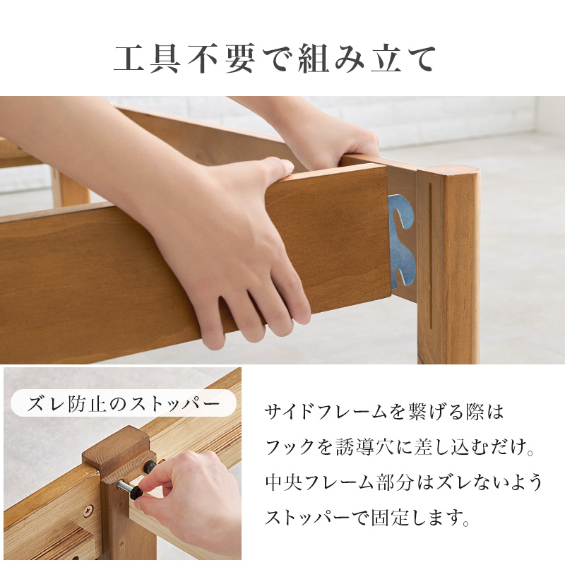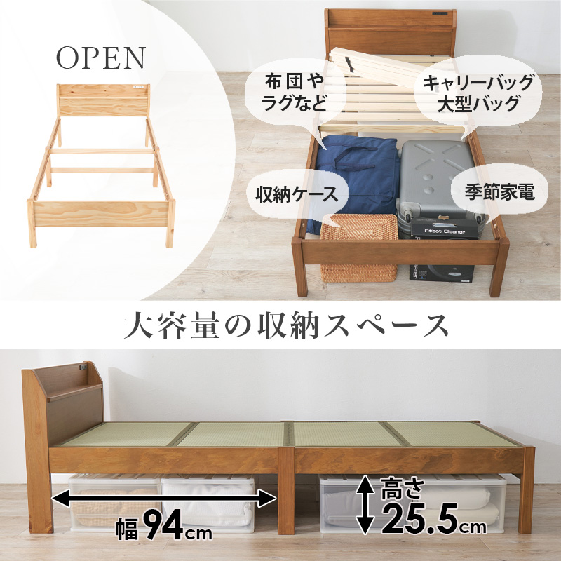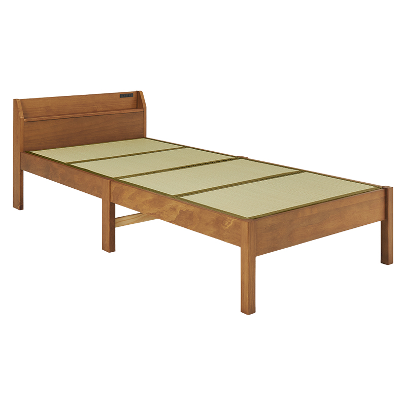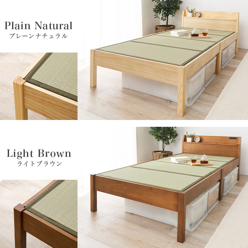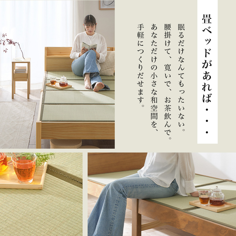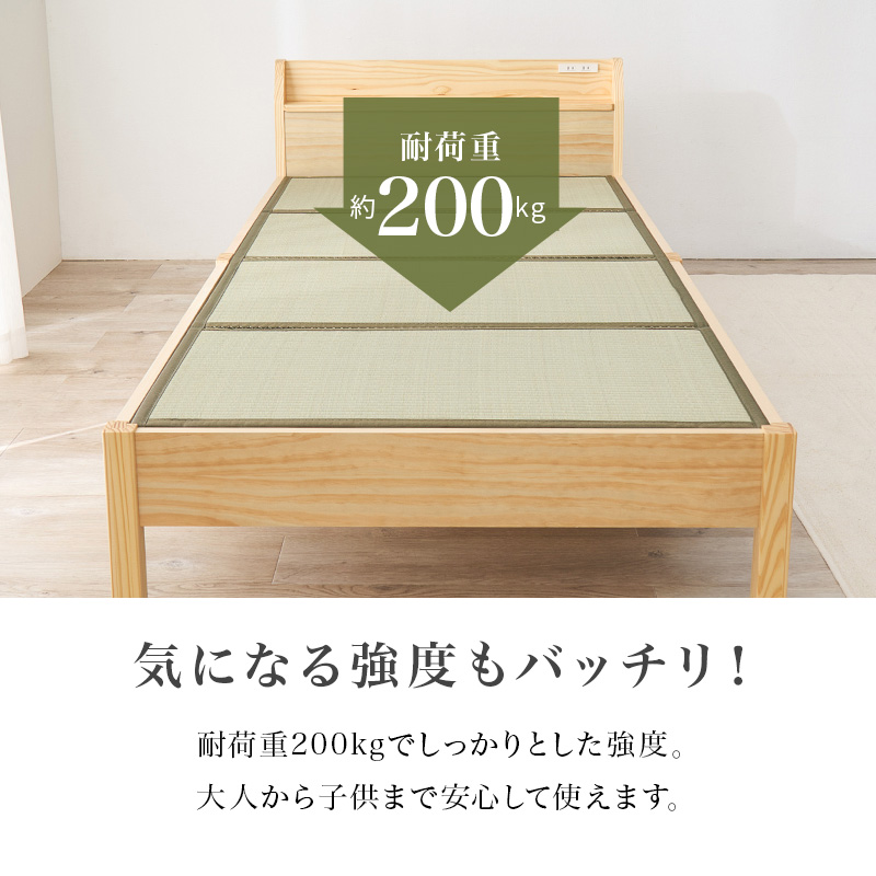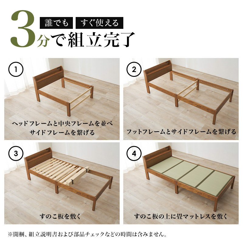 ネジなし、工具不要で簡単組立。爽やかな天然い草を使用した畳マットをすのこベッドに合わせました。スマートフォンなどの充電やライトの取り付けに便利な宮棚とコンセント付き