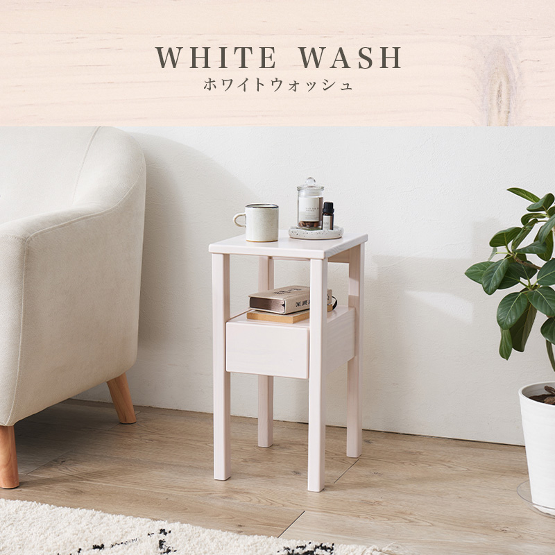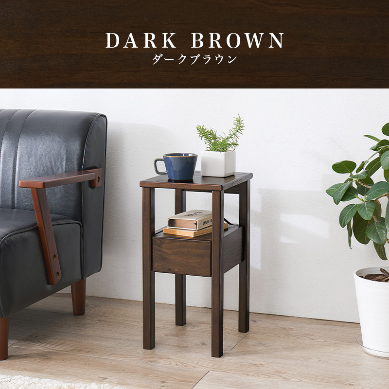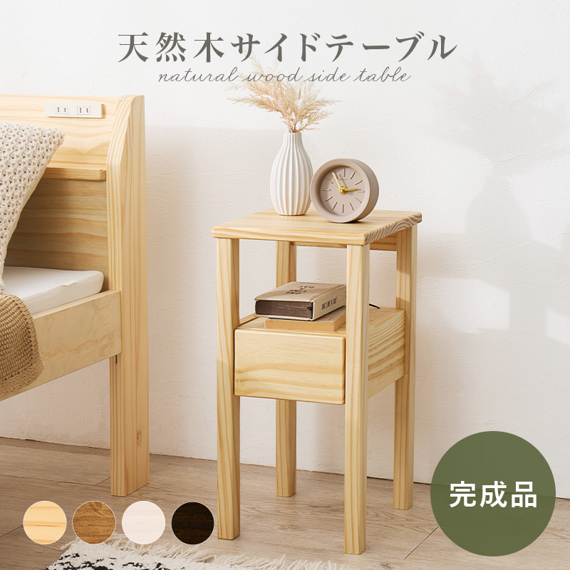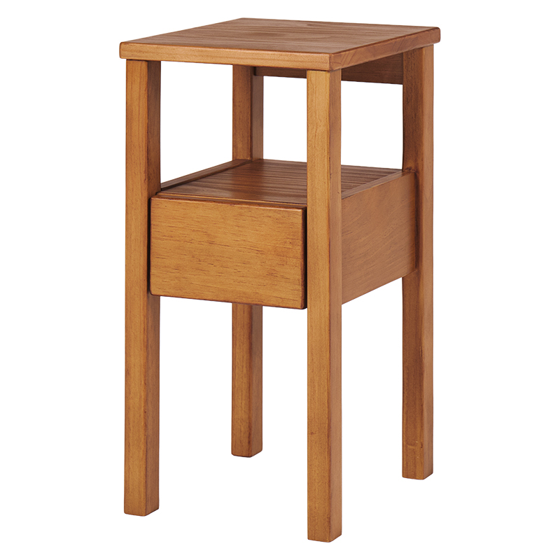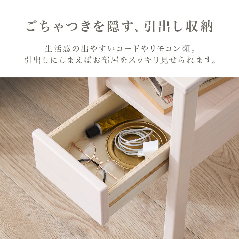 ベッドサイドやソファーサイドに置きやすいコンパクトサイズ。オープン棚と引出し付きで使いやすい。