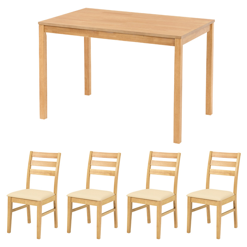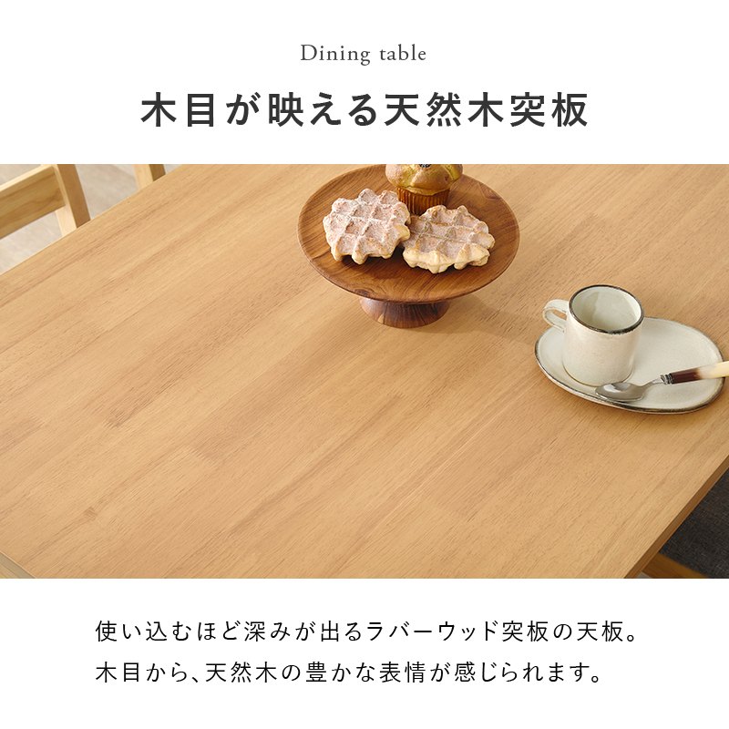 天然木の風合いが空間を心地よく彩るダイニングセット。コンパクトな長方形のテーブルと、シンプルデザインのチェアです。