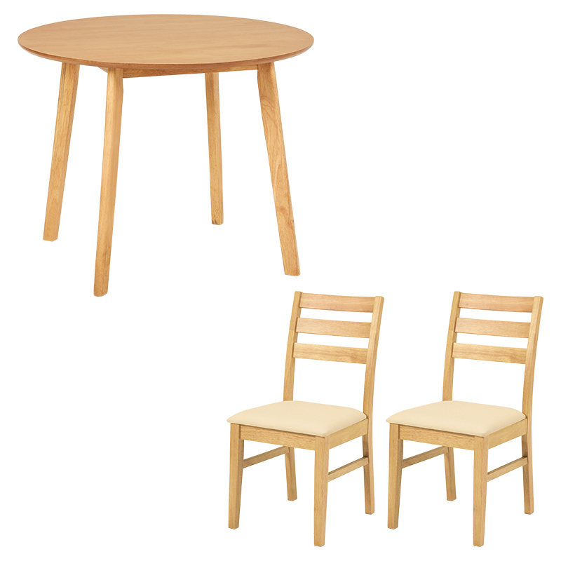 天然木の風合いが空間を心地よく彩るダイニングセット。円形のテーブルと、シンプルデザインのチェアです。