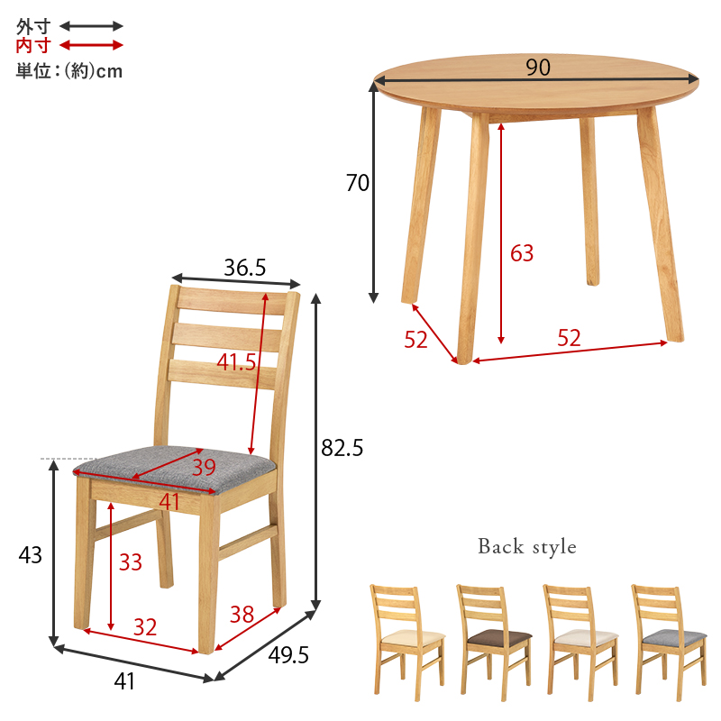 | サイズ | テーブル:(約)幅90×奥行90×高さ70cm、チェア:(約)幅41×奥行49.5×高さ82.5×座面高43cm |