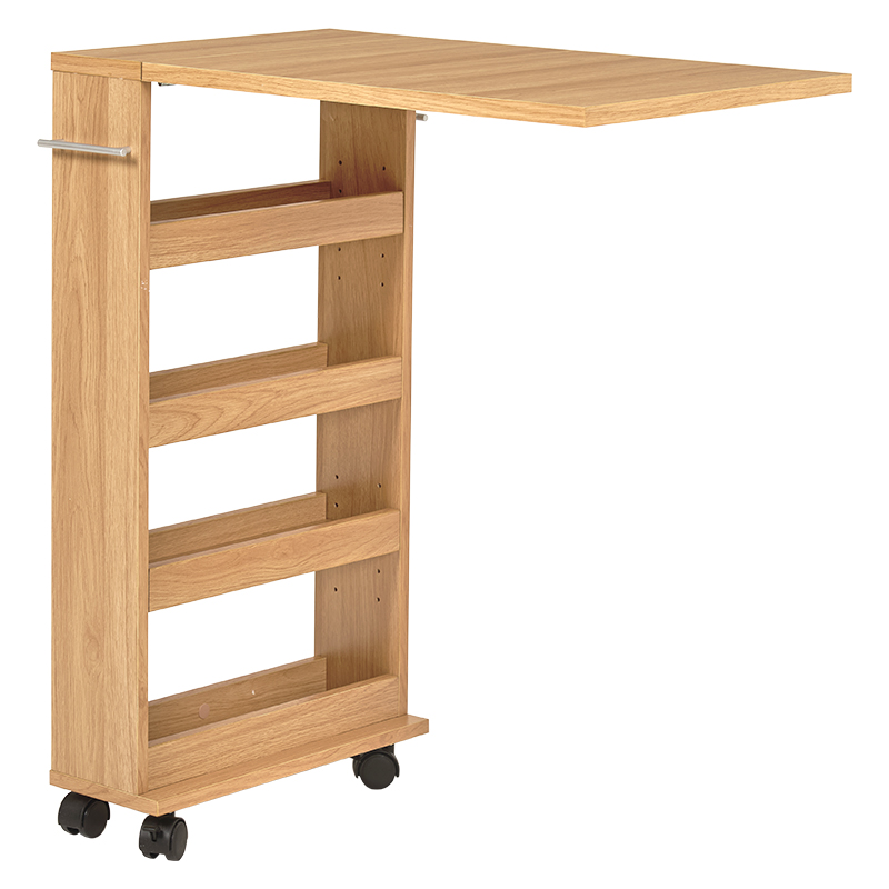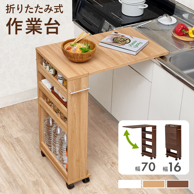 キッチンカウンターやシンクに天板を広げて乗せると、広々作業スペースに。たたむとスリムなラックになるので、調味料を収納したまま壁際や隙間に収納できて便利。