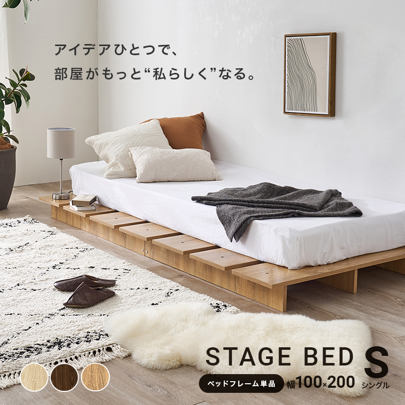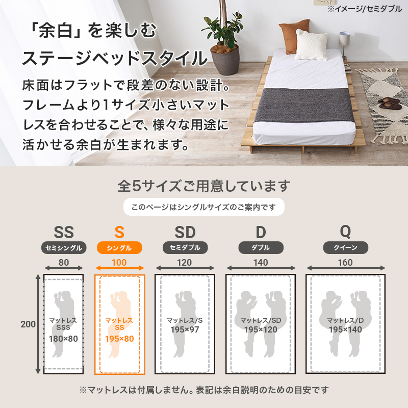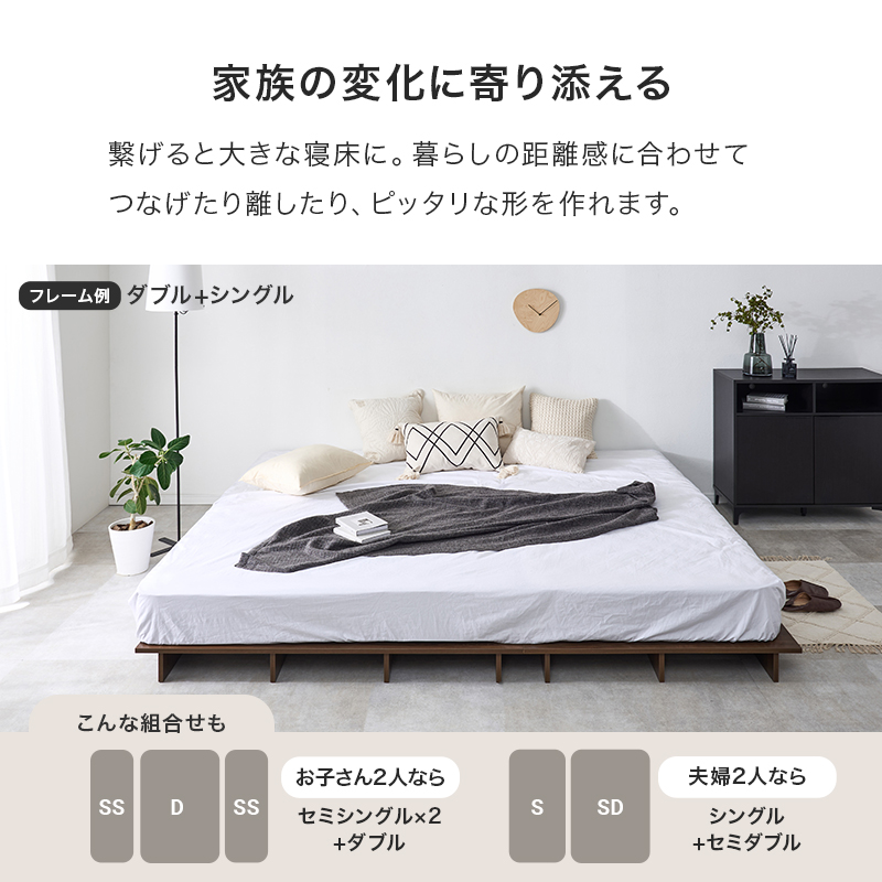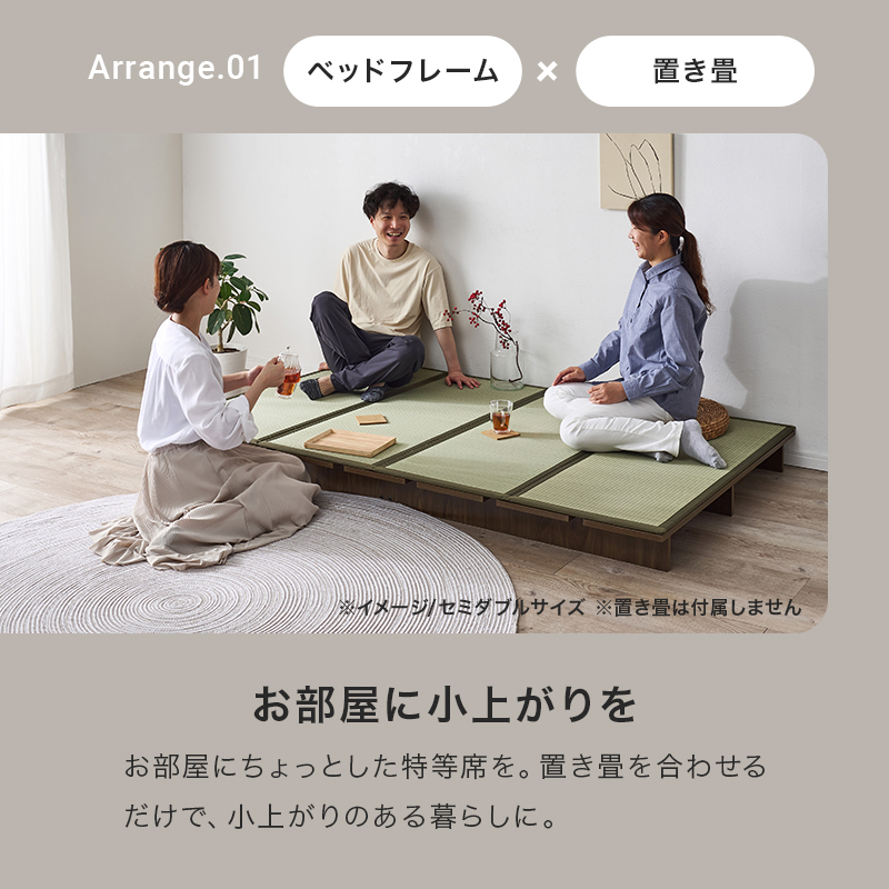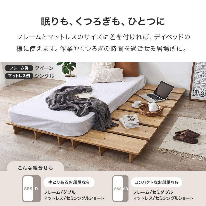 お部屋が広く感じるロースタイル。マットレスのサイズやクッション、置き畳と組み合わせれば、ベッドとしてもくつろぎスペースとしても置き方次第で自分らしい居場所が作れます。