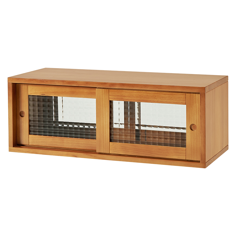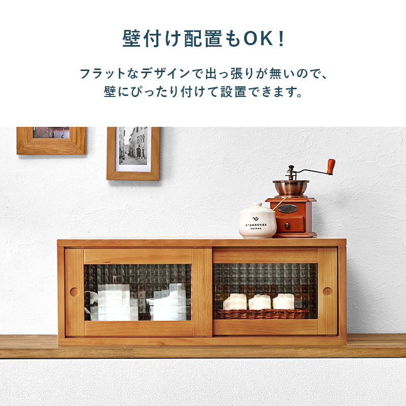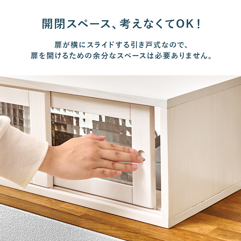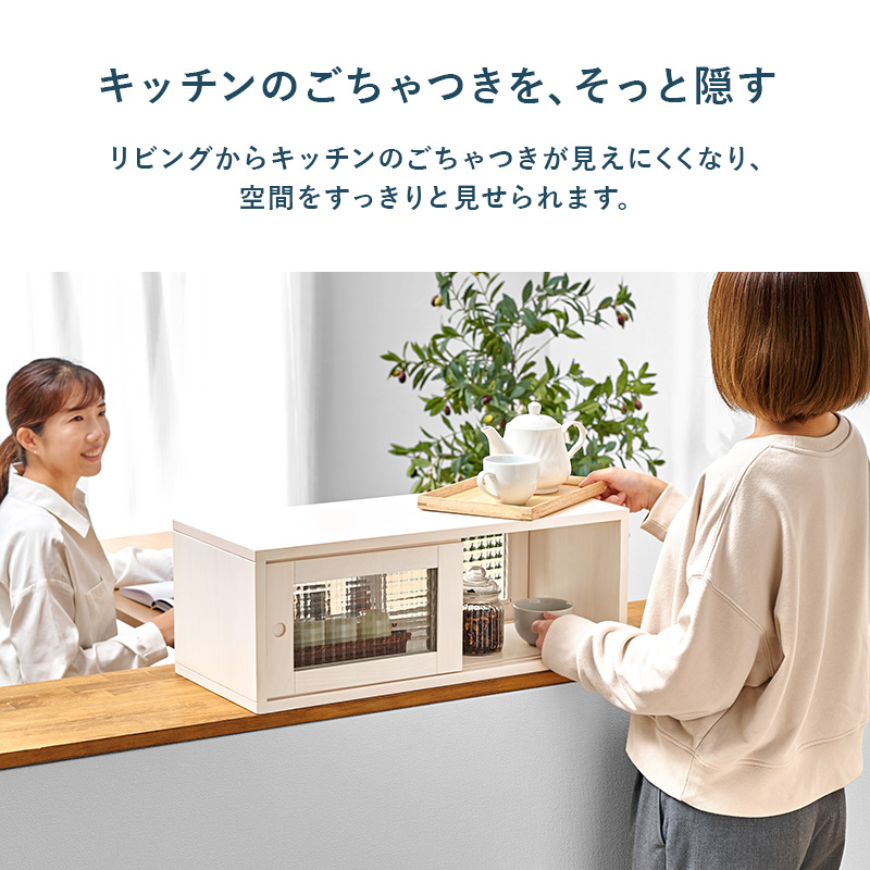 カウンター上の調味料やコップなどをまとめて収納。前後両方から出し入れ可能な引き戸は、ほどよく中身を隠すデザインガラスを使用しています。