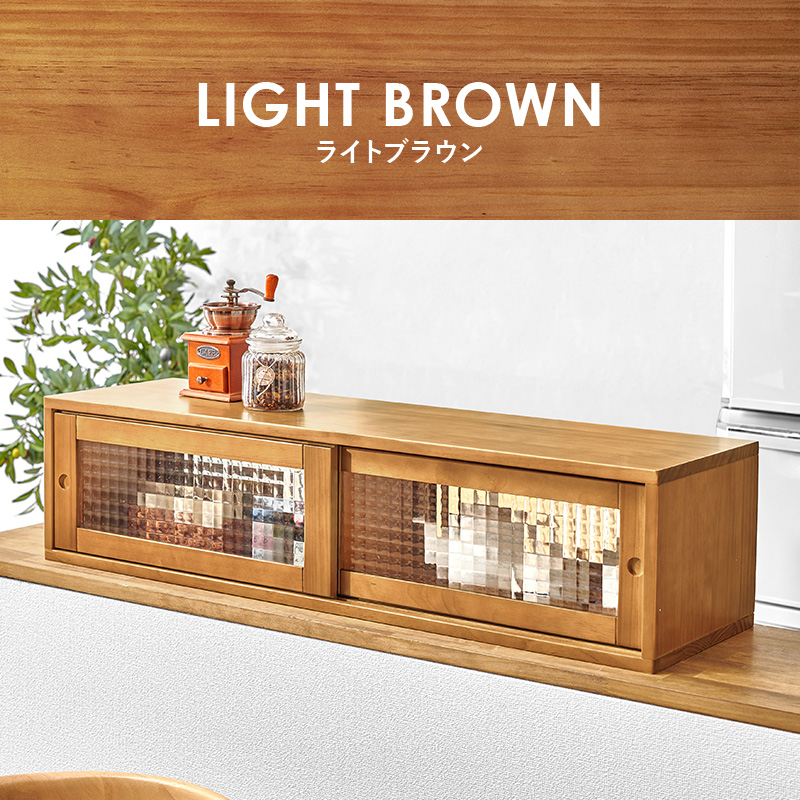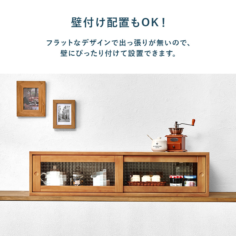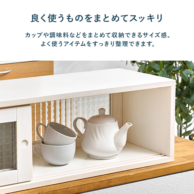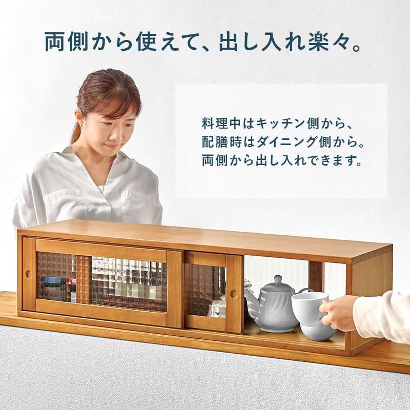 カウンター上の調味料やコップなどをまとめて収納。前後両方から出し入れ可能な引き戸は、ほどよく中身を隠すデザインガラスを使用しています。
