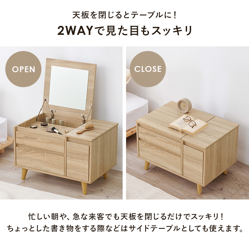 天板を開くとドレッサーとして使えるコスメテーブル。メイクがしやすい大きなミラーや収納がついているのに幅60センチとコンパクトでお部屋に置きやすいサイズです。