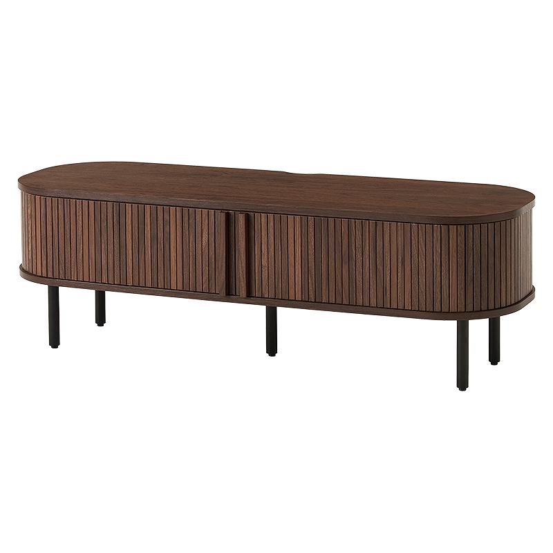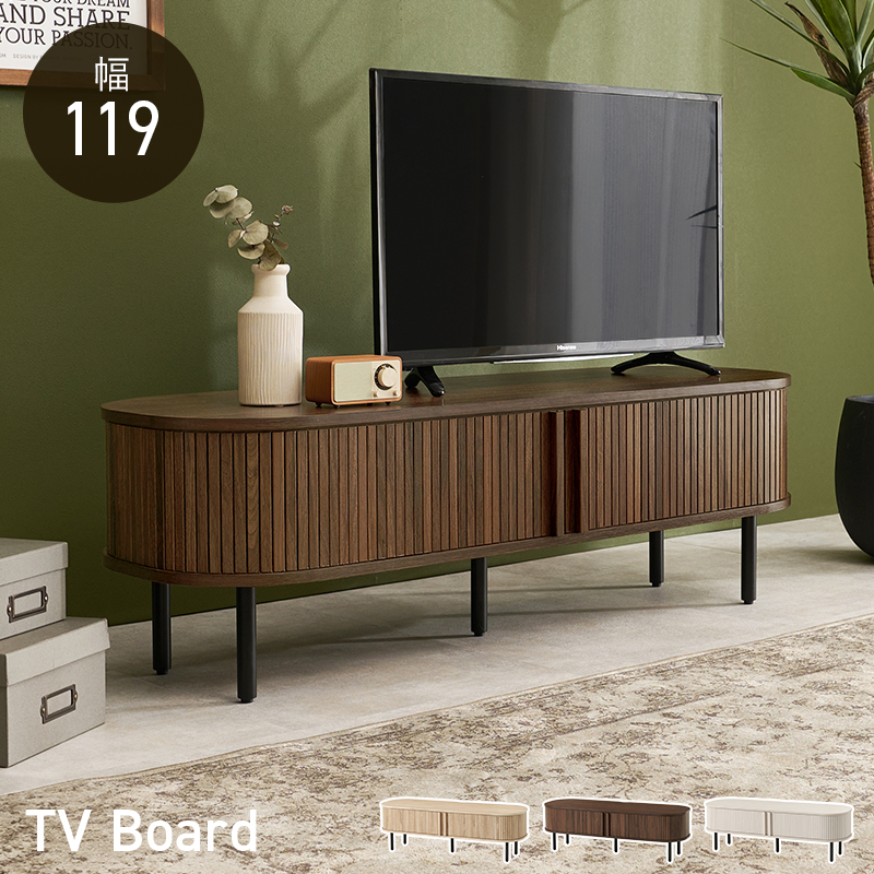 縦のラインとサイドの曲線が美しいタンブール扉のテレビ台。扉の開閉に場所を取らず、すっきりとした脚高デザインもポイントです。ローボードとしても使用可能