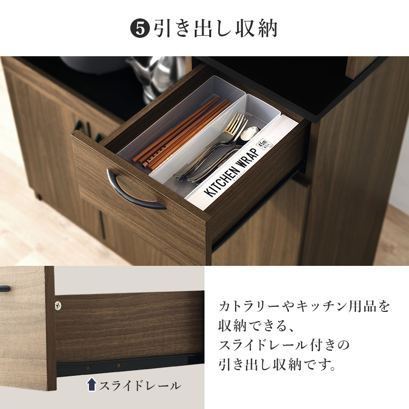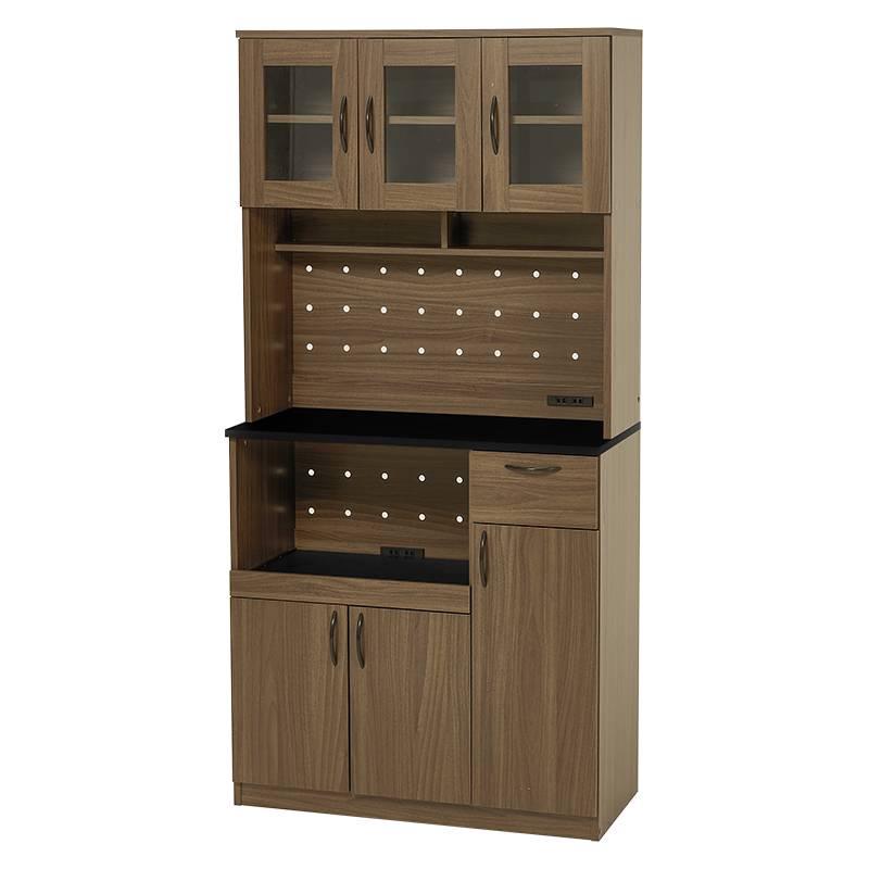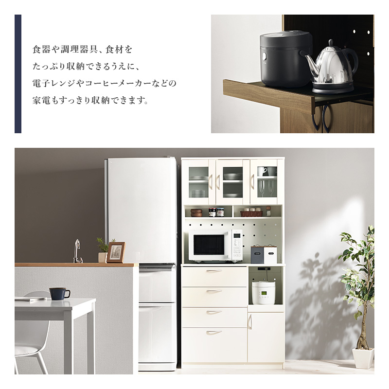 食器やキッチン家電、食品ストックまでたっぷり収納できるハイタイプのキッチンボード。扉部分には可動棚がついており、収納するものに合わせて高さが変えられます。