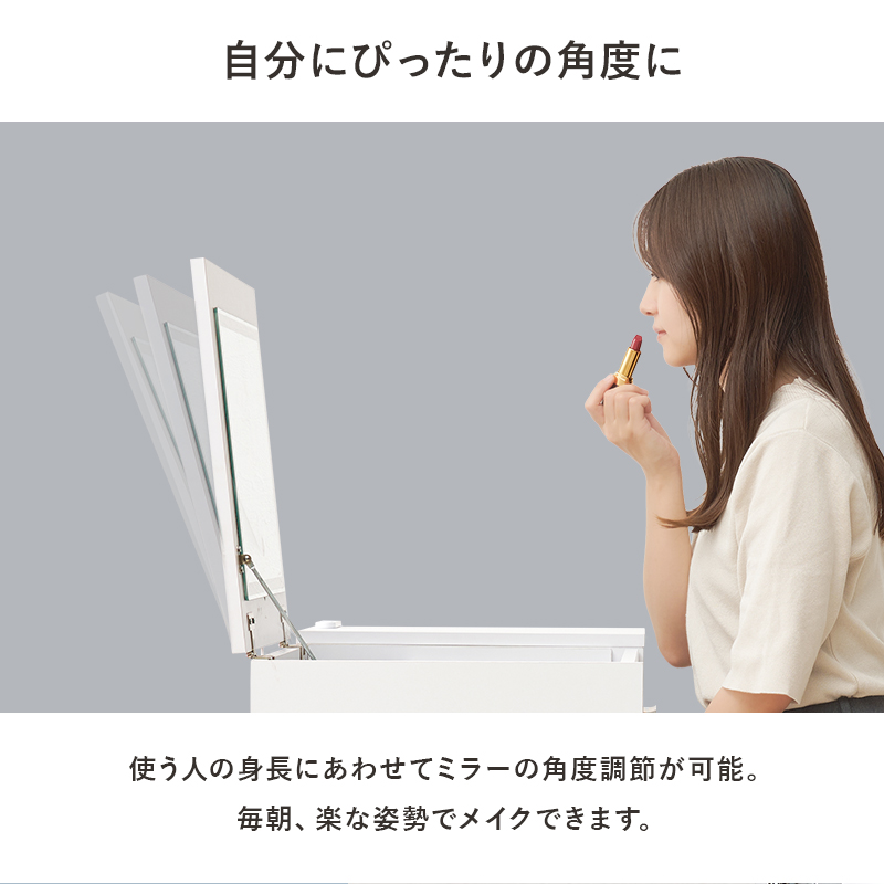 天板を閉じればデスクとして使える2WAYドレッサーセット。LEDライト付きでメイクがしやすく、ストック品の収納にも使えるスツール付き。