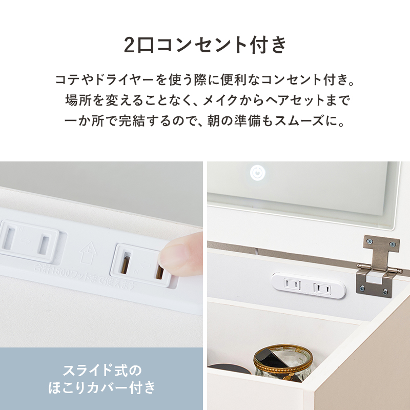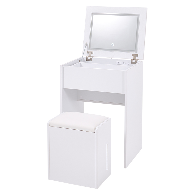 天板を閉じればデスクとして使えるスリムな省スペースタイプの2WAYドレッサーセット。LEDライト付きでメイクがしやすく、ストック品の収納にも使えるスツール付き。