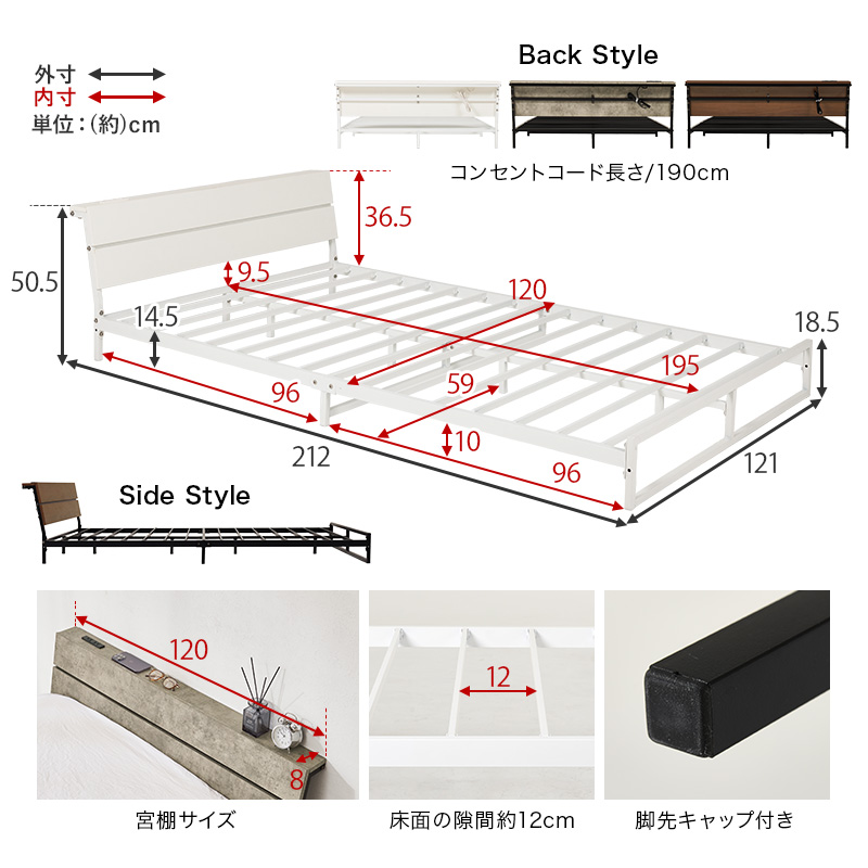 スチールフレームでスッキリとした印象のセミダブルベッド。ロータイプ設計なので寝室を広く心地よく演出します。便利な2口コンセント付き