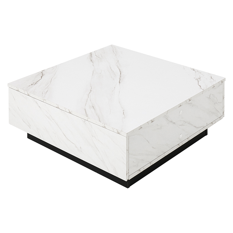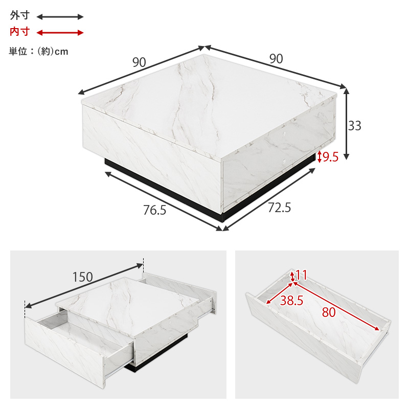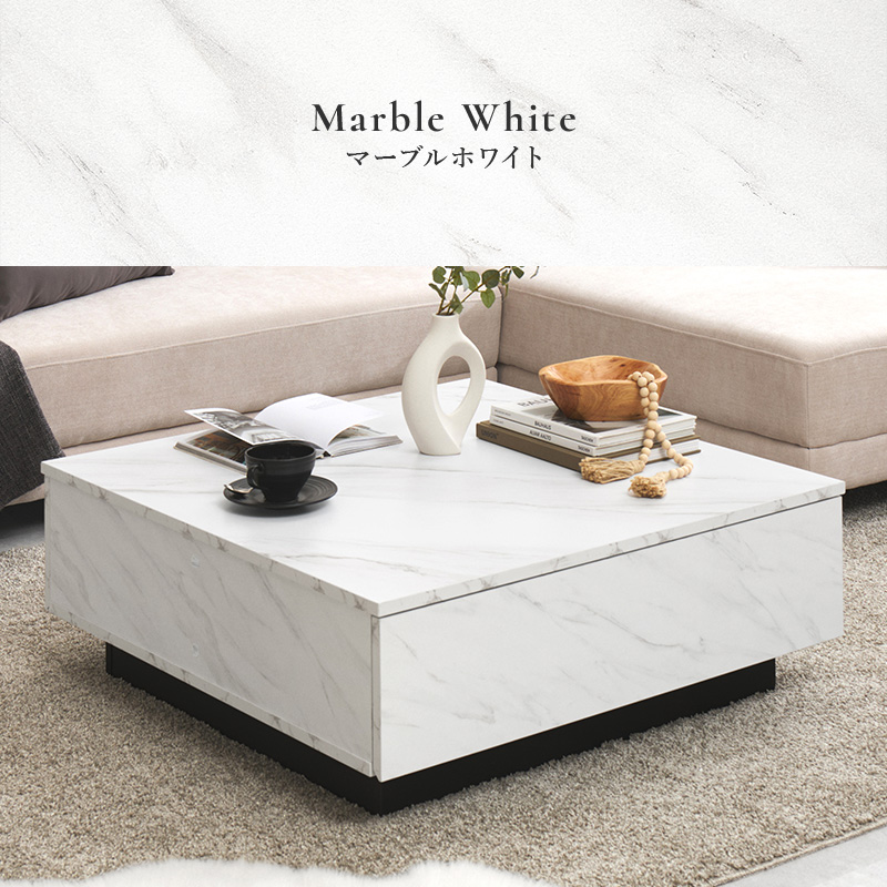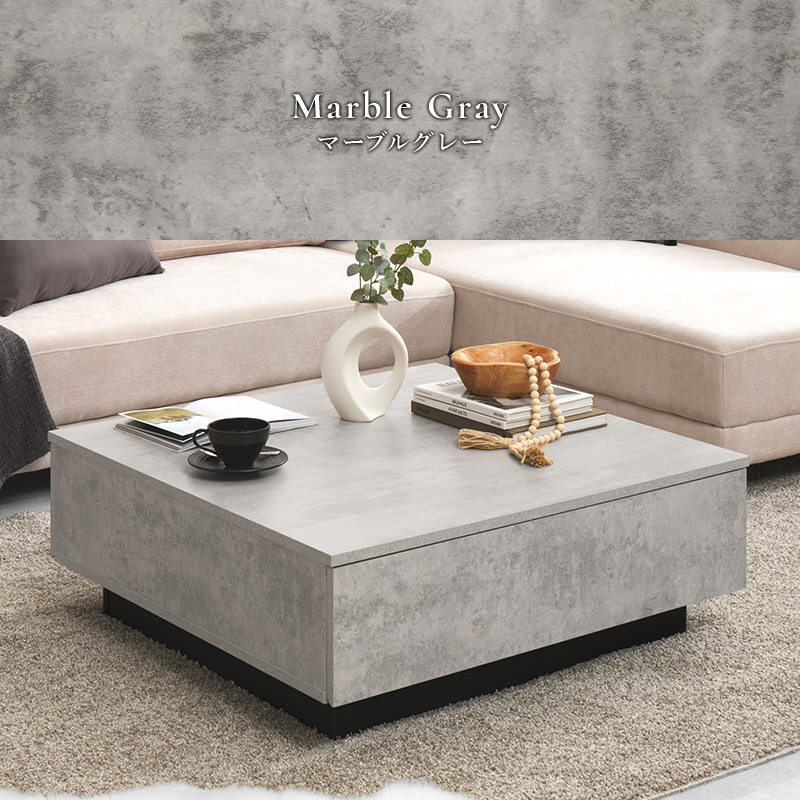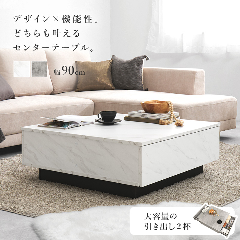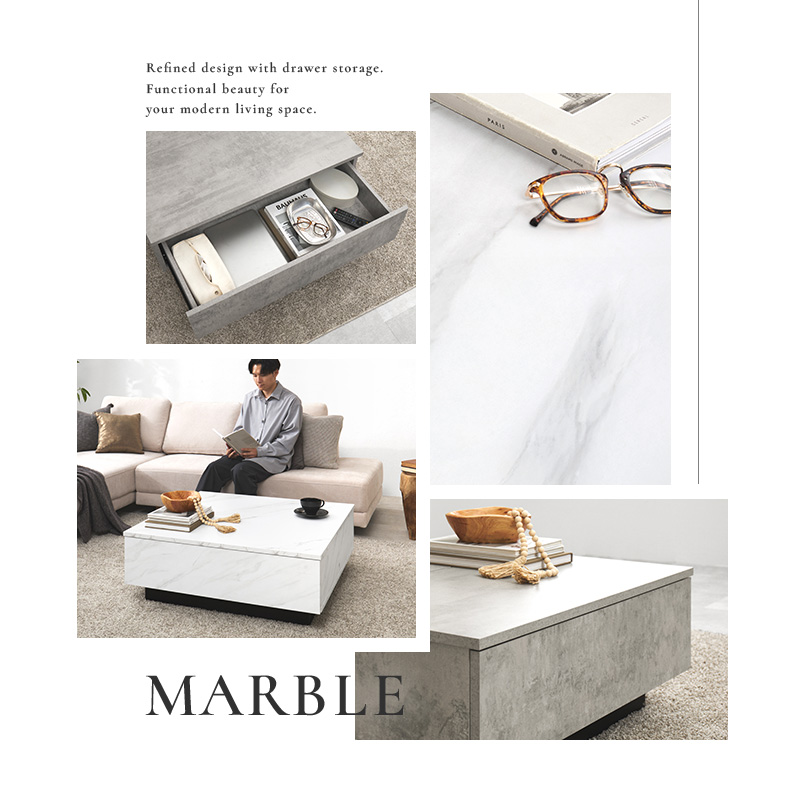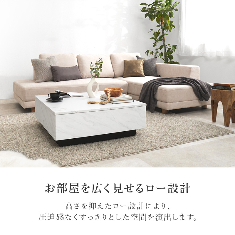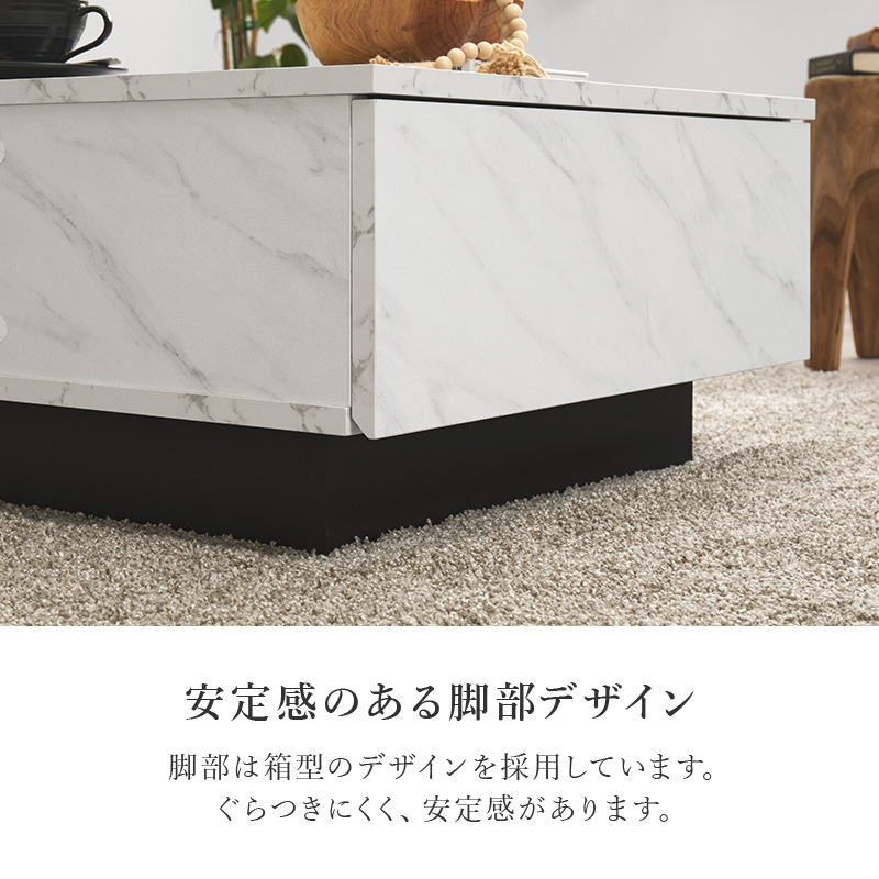 お部屋を広く見せるロータイプの石目調テーブル。大きな引出し2杯付きで生活感が出やすいリビング小物を収納できます。