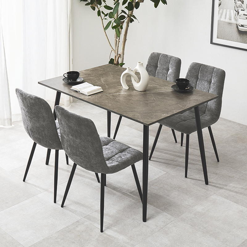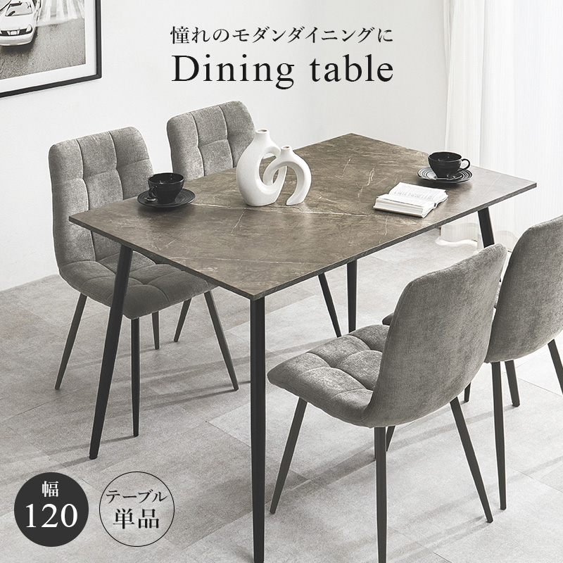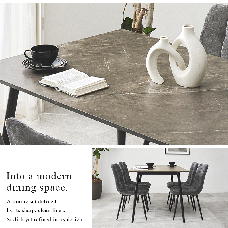 モダンインテリアに映えるグレーの大理石調の天板と細身のブラックアイアンの脚がおしゃれな大人のダイニングを演出します。
