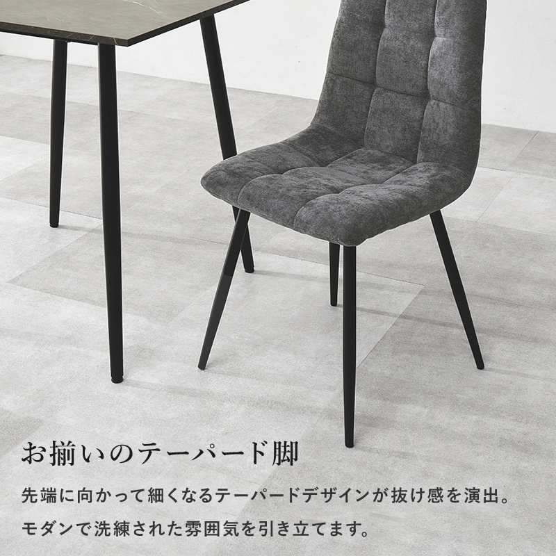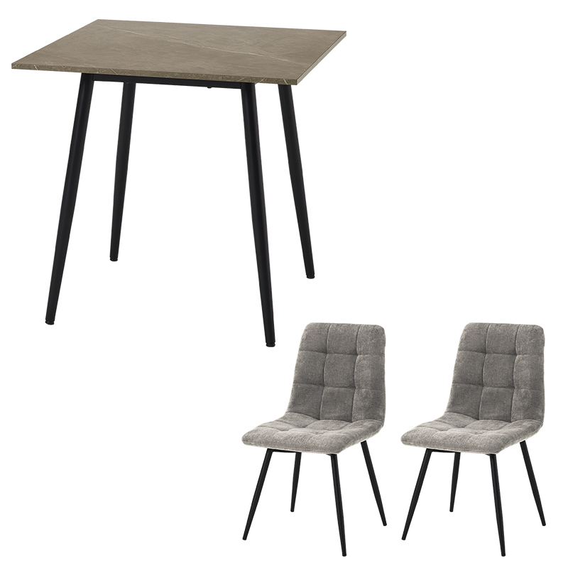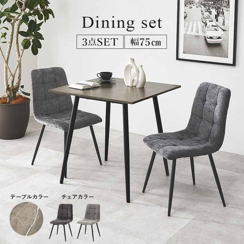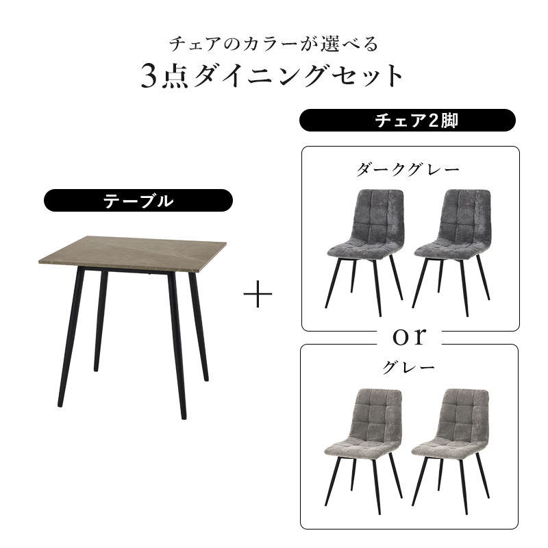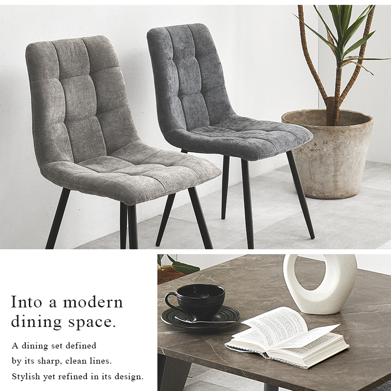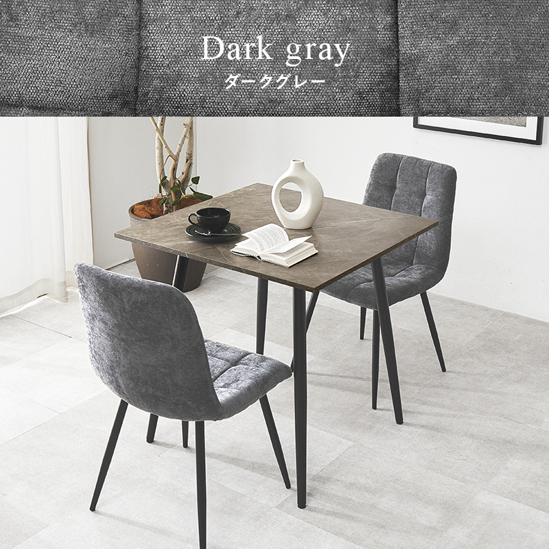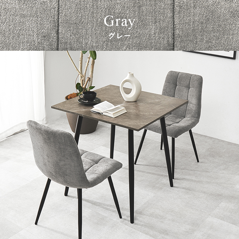モダンインテリアに映えるグレーの大理石調のテーブルに陰影が美しいファブリックチェアを合わせた3点セット。細身のブラックアイアンの脚がおしゃれな大人のダイニングを演出します。