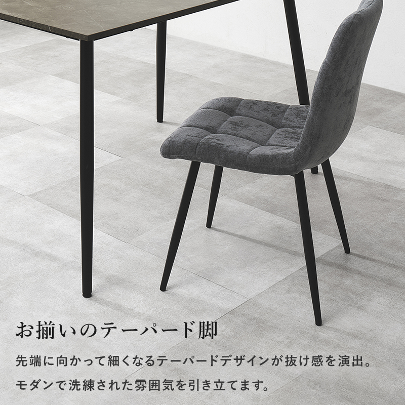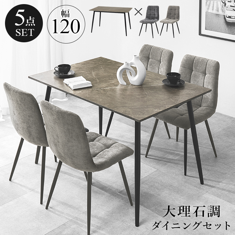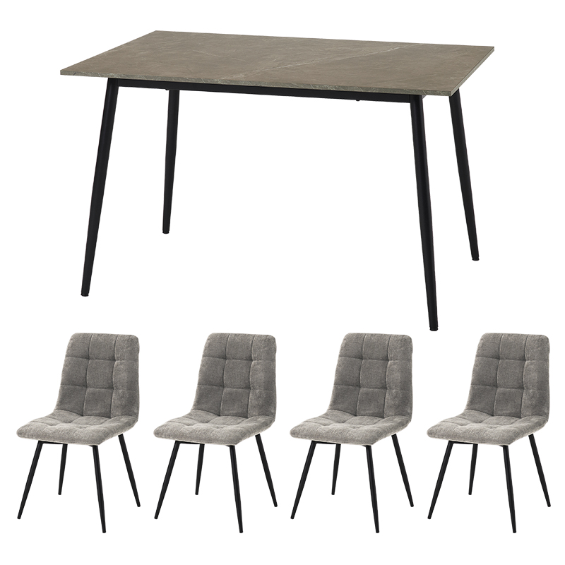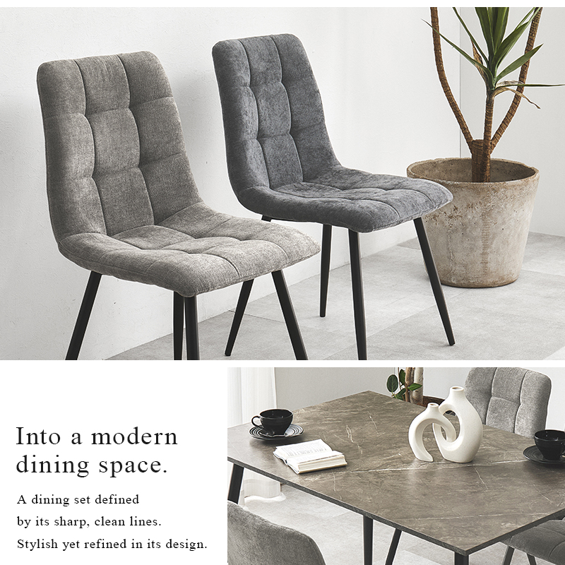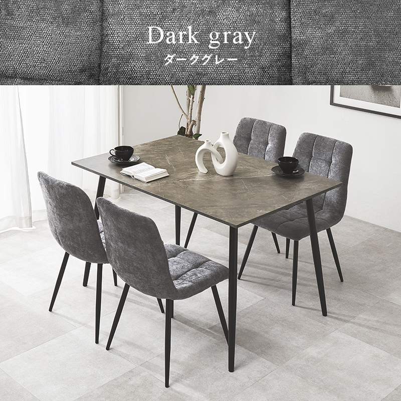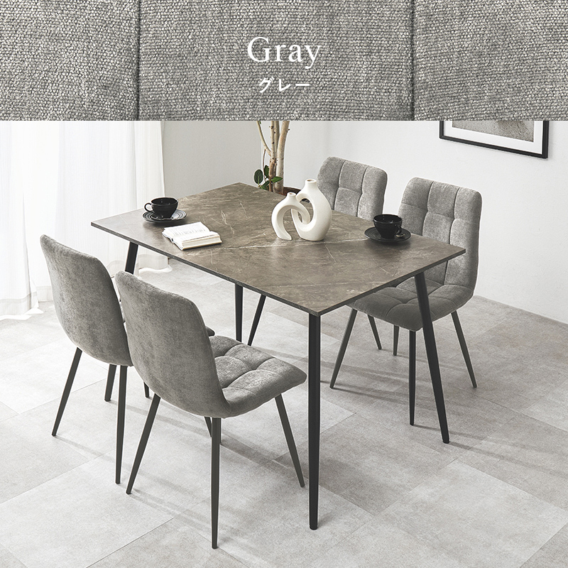 モダンインテリアに映えるグレーの大理石調のテーブルに陰影が美しいファブリックチェアを合わせた5点セット。細身のブラックアイアンの脚がおしゃれな大人のダイニングを演出します。