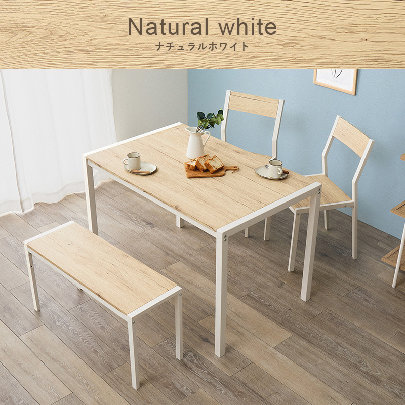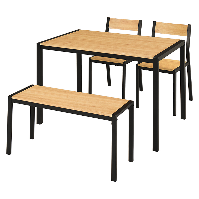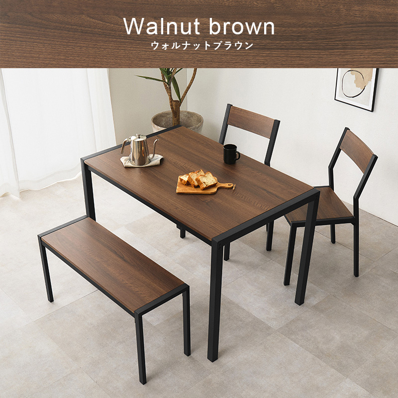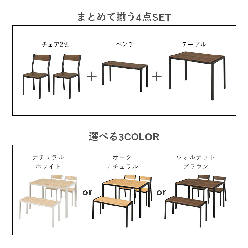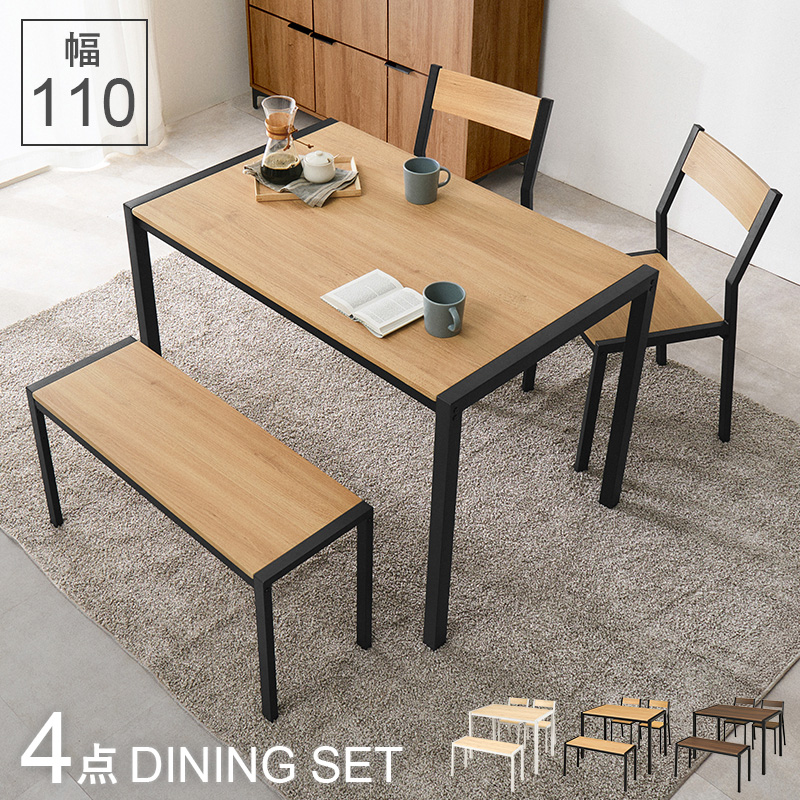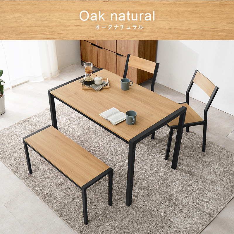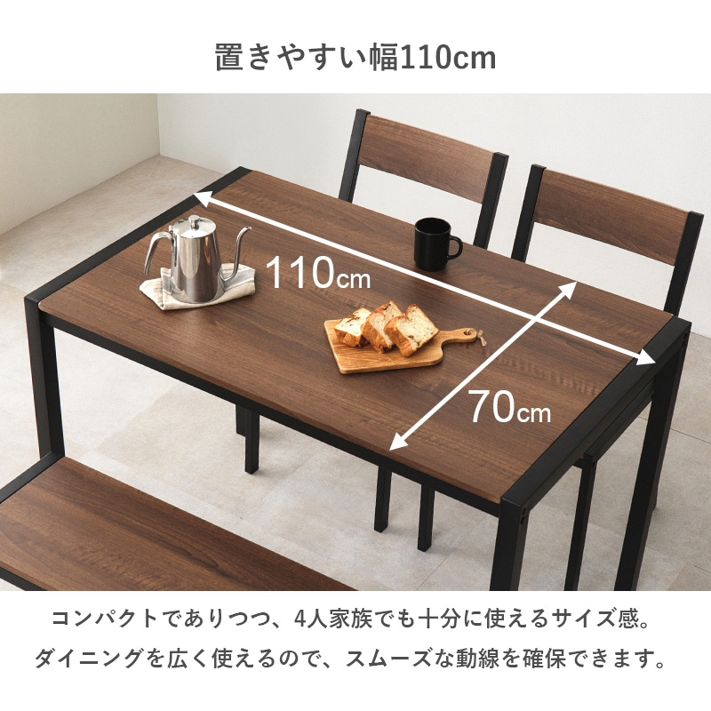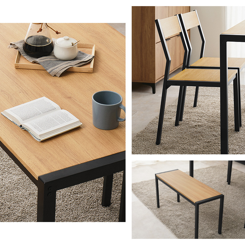 温かみのある木目調天板とアイアンフレームを組み合わせたダイニング4点セット。シンプルなデザインで、コンパクトでありつつ4人でも使えるサイズ感。