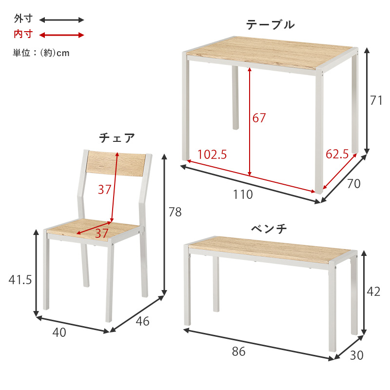 | サイズ | テーブル:(約)幅110×奥行70×高さ71cm、チェア:(約)幅40×奥行46×高さ78×座面高41.5cm、ベンチ:(約)幅86×奥行30×高さ42cm |