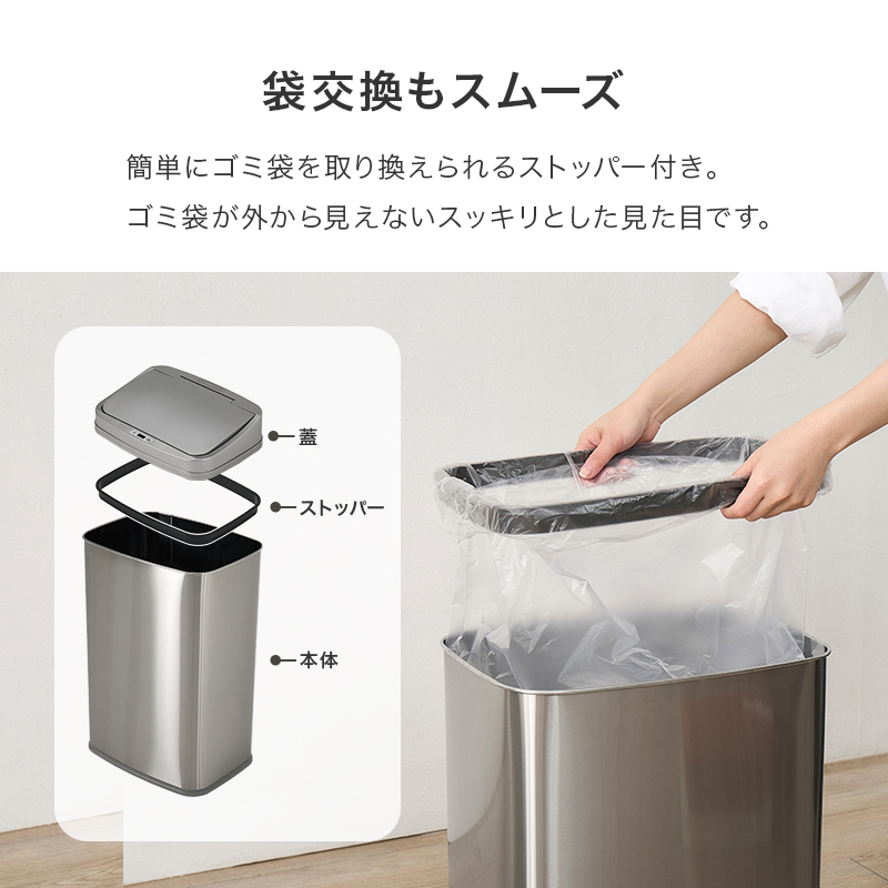 濡れた手、汚れた手でも大丈夫。手をかざすとセンサーが反応して自動でふたが開くのでお料理中のゴミ捨てなどに便利。普段は中が見えないのでリビングにも置きやすいシンプルデザイン。