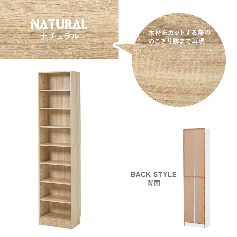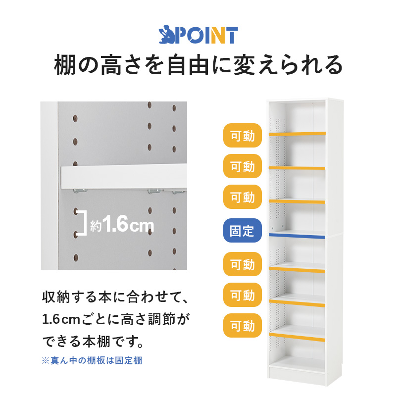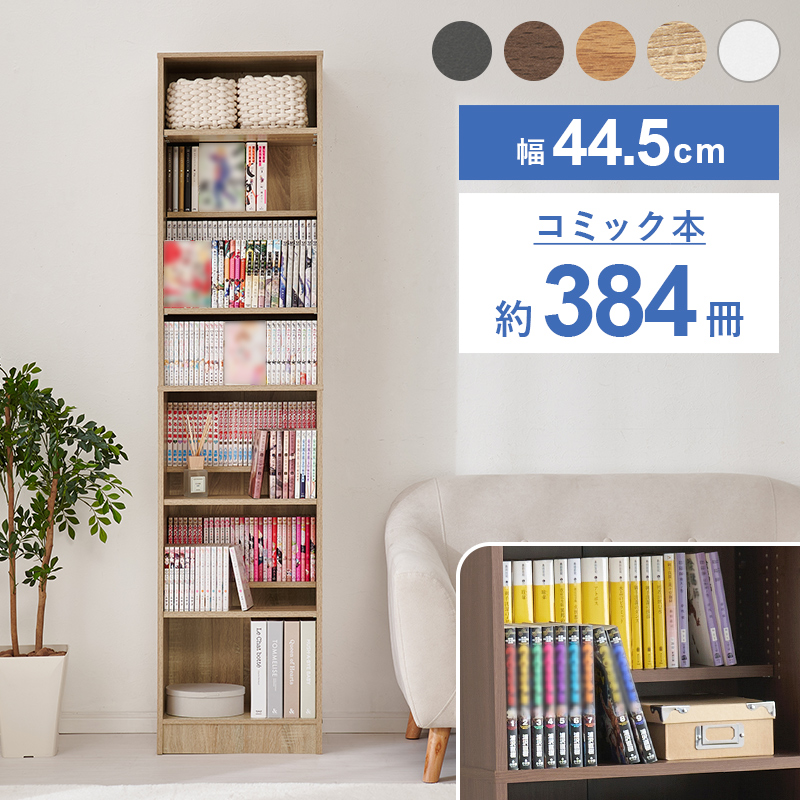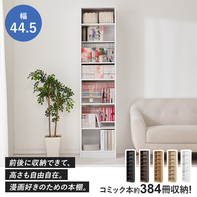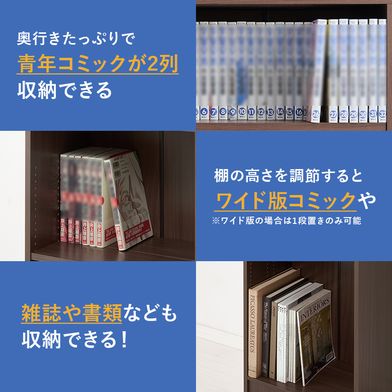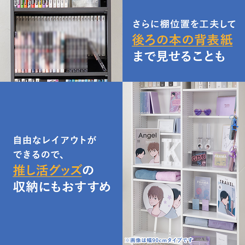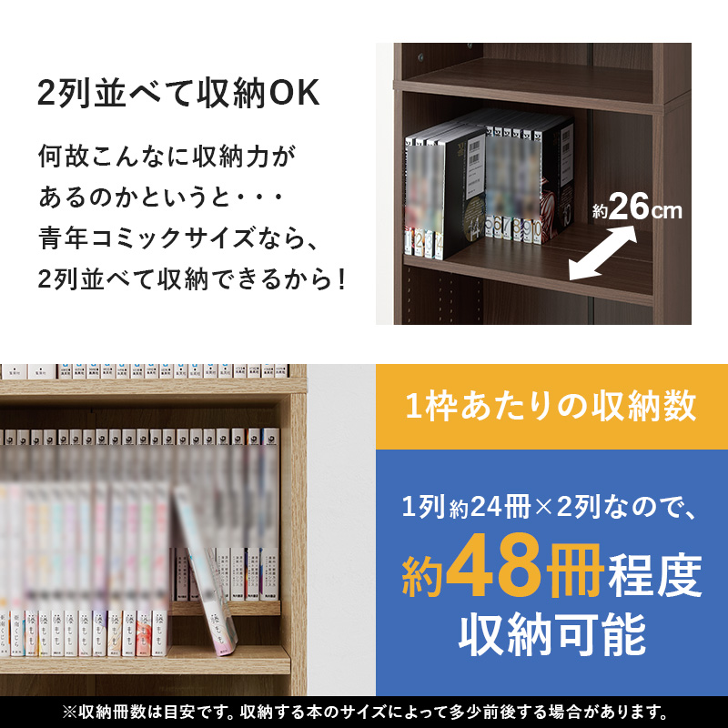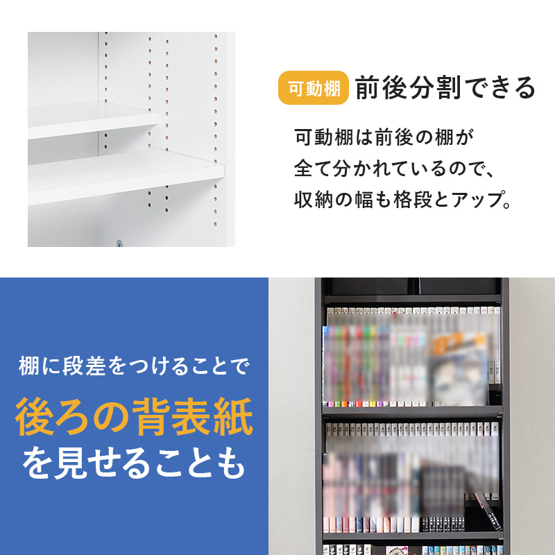 前後2列別々に棚板高さが変えられ、大容量収納できるマンガ好きの為の本棚。