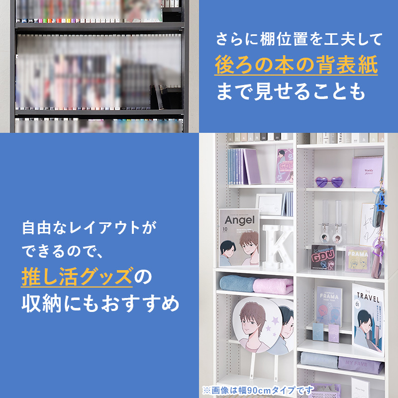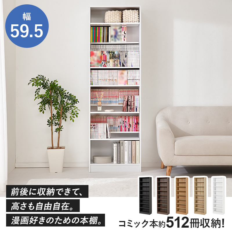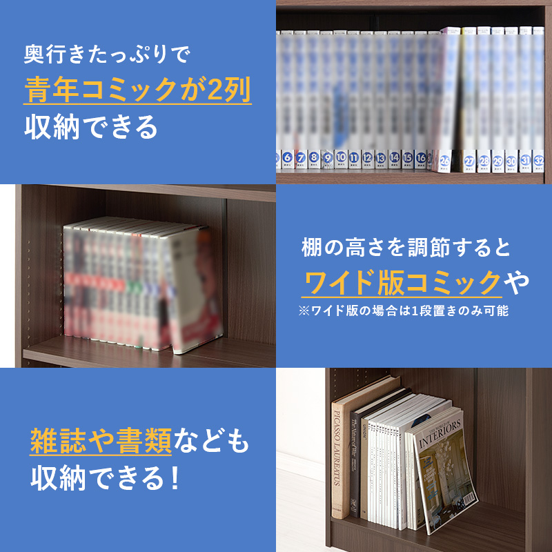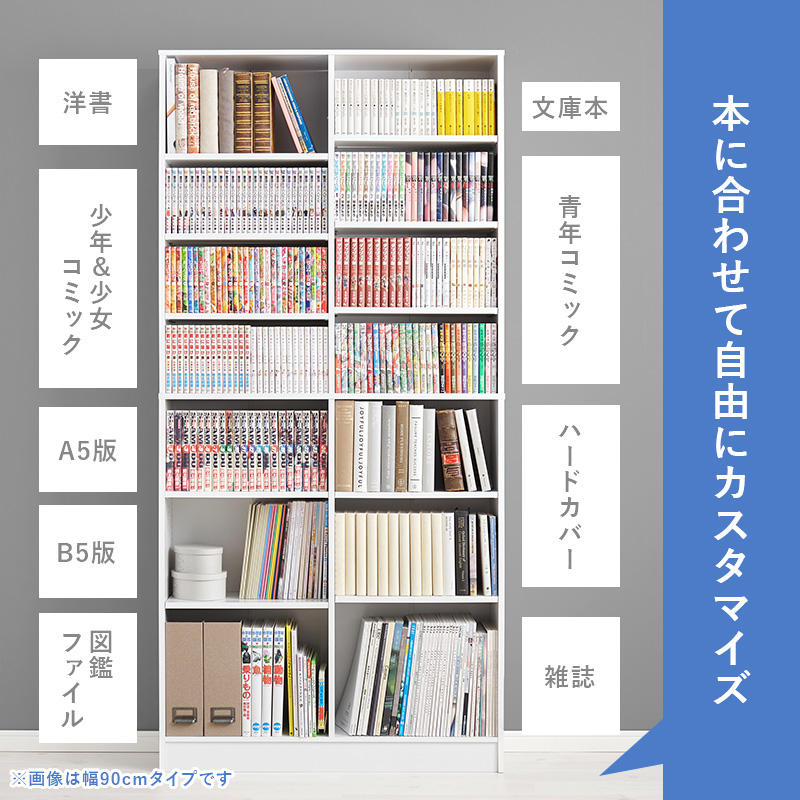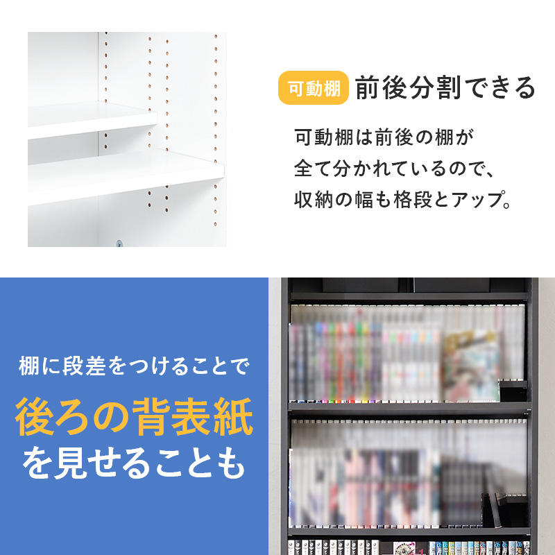 前後2列別々に棚板高さが変えられ、大容量収納できるマンガ好きの為の本棚。