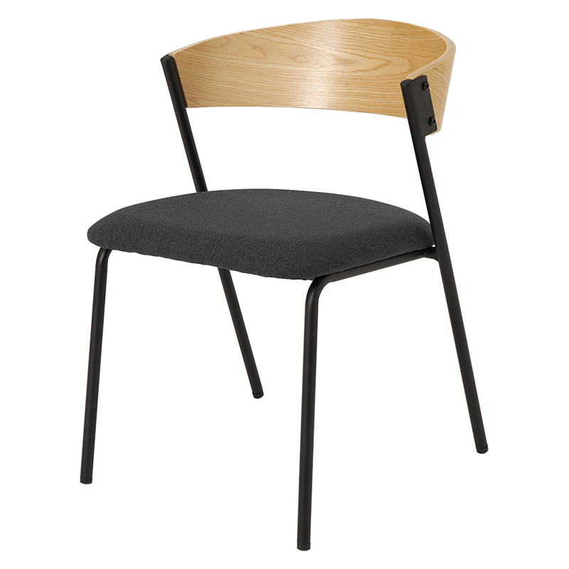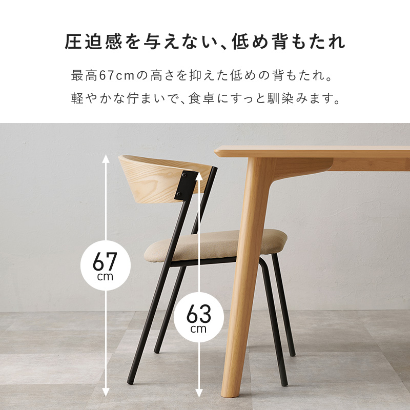 木と鉄と張地の素材の良さが詰まったデザイン。美しい背もたれのカーブは背中に沿う形になっています。