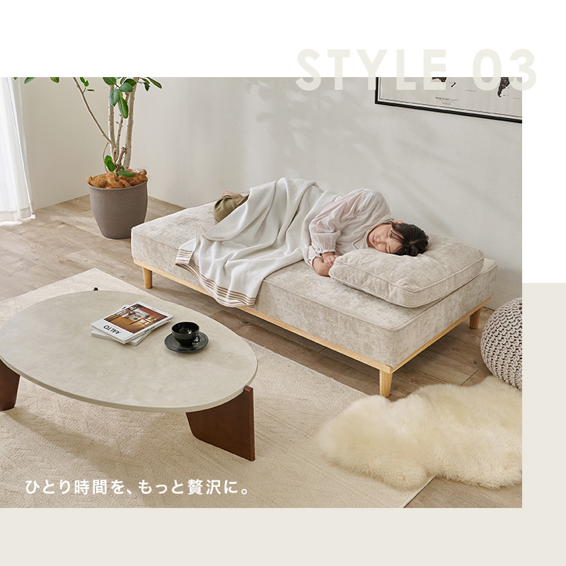 背もたれ、クッションを自由自在に配置できるアイランドソファ。向きを変えて座ったり、寝転んだり、生活スタイルや気分に合わせてくつろぎ方を変更できます。ロー/ハイ兼用