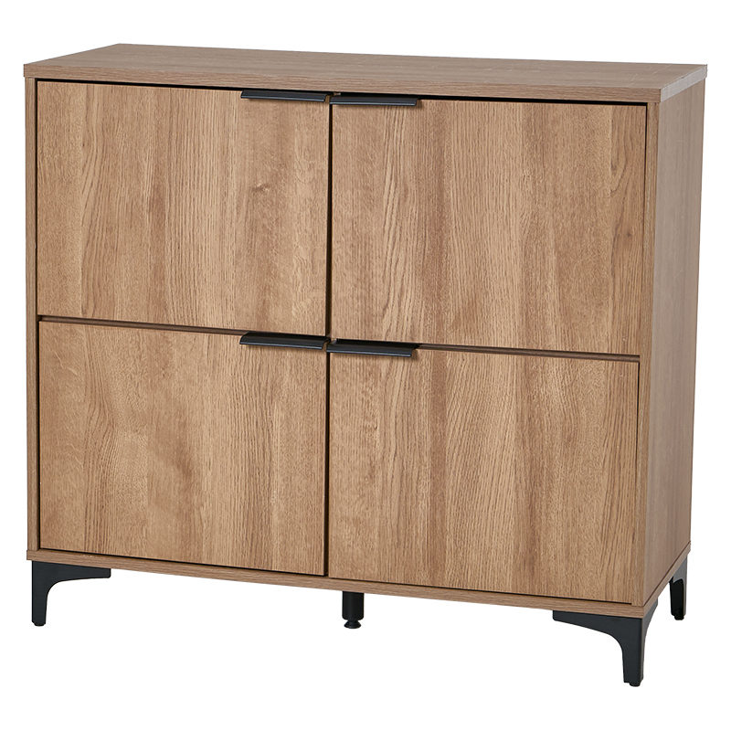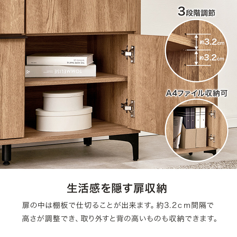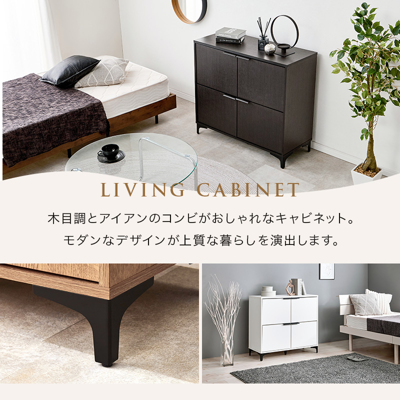 木目調の本体とアイアンの脚部のコンビがおしゃれなキャビネット。扉ごとに中が区切られているので収納するものの用途別に生活感をスッキリ隠せます。