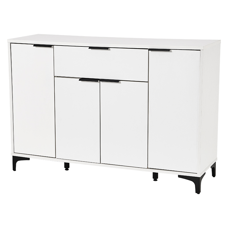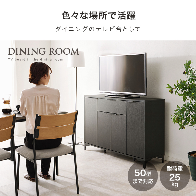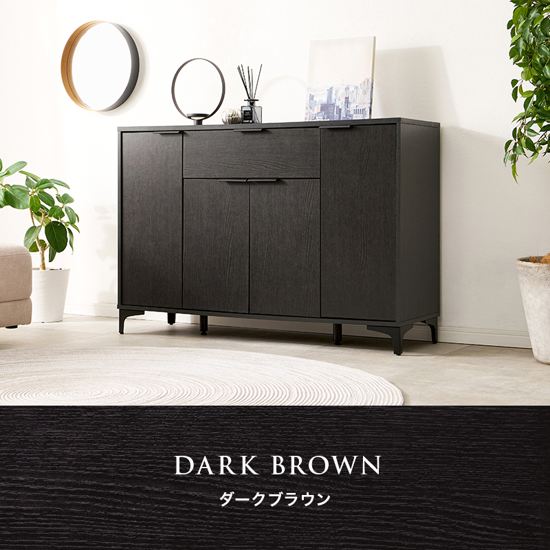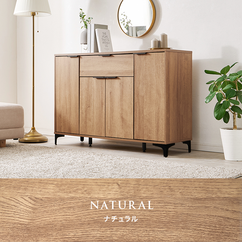 木目調の本体とアイアンの脚部のコンビがおしゃれなキャビネット。よく使うものを取り出しやすい引出しと生活感をスッキリ隠せる扉収納が魅力的。