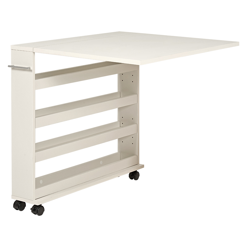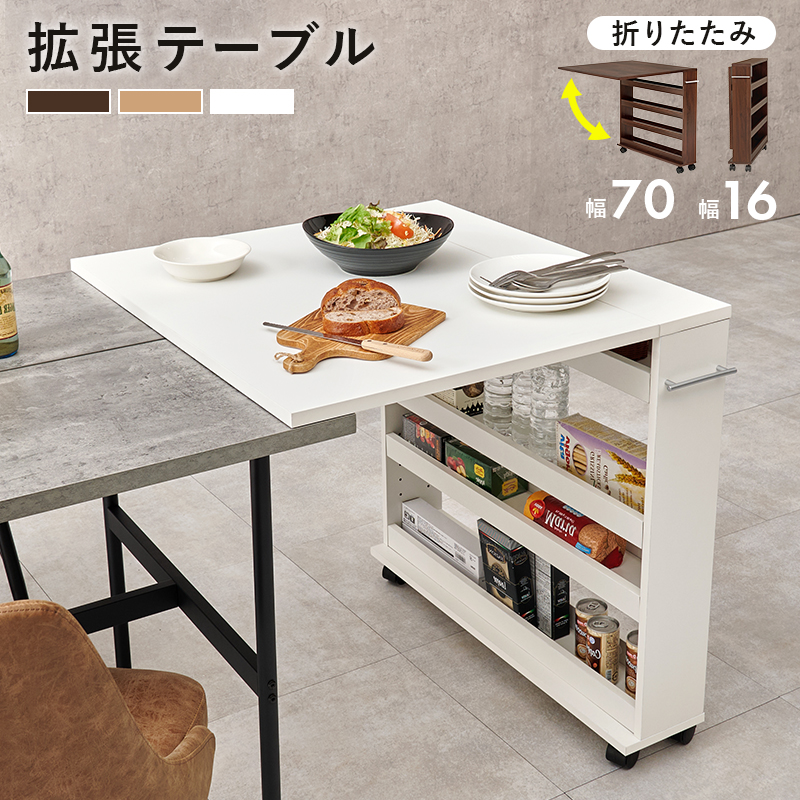 来客時やテーブルがいっぱいの時にダイニングテーブルの配膳スペースを拡張できる補助テーブル。たたむとスリムなラックになるので、調味料やカトラリーを収納したまま壁際や隙間に収納できて便利。※補助テーブルのため着席して飲食等のご使用はできません。
